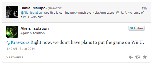 Baš kao što su glasine sugerirale, Alien: Isolation će se krajem godine pojaviti na PC, current-gen (PlayStation 3 i Xbox360) i next-gen (PlayStation 4 i Xbox One) plaftormama (Wii U inačica je izostavljena iz najave, razvojni tim trenutno nema namjeru raditi istu te je velika šansa da se neće uopće pojaviti).