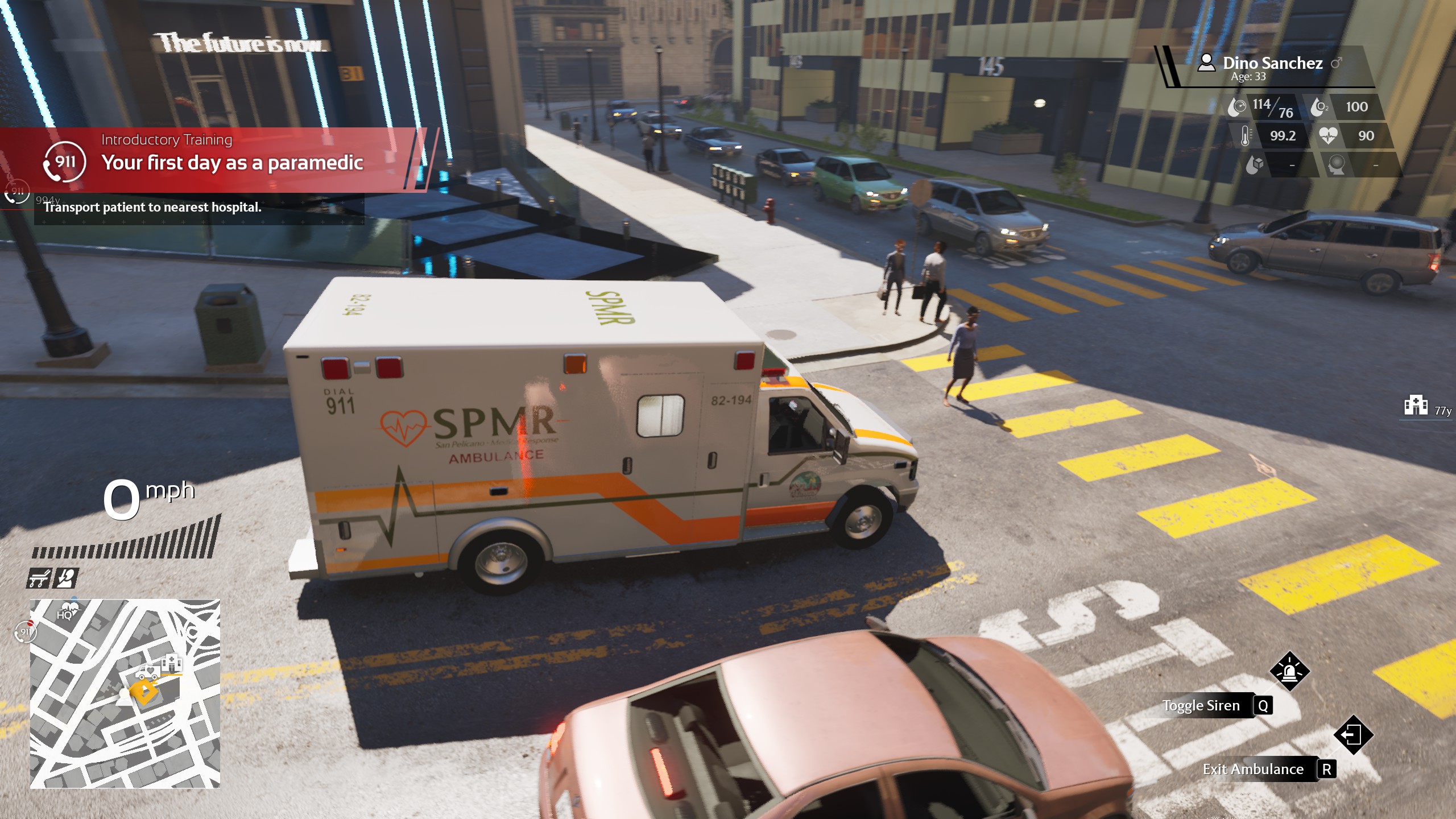Glavna petlja igranja je jednostavna: primite poziv iz dispečerskog centra, jurnete na mjesto nesreće, dijagnosticirate i tretirate ozlijeđene, a zatim ih transportirate u bolnicu. Vožnja u ovoj igri je prolazna, glavni problem leži u tome što je skretanje jako loše, ali vjerno oponaša fizike vozila. Međutim, umjetna inteligencija je također vrlo loša. Automobili se pomalo pomiču kad čuju sirenu, ali često vas ostavljaju da se provlačite kroz uske prolaze ili ostanu zaglavljeni na vječno crvenom svjetlu. Osim toga, uopće ne reagiraju gdje im prolazite, nego su programirani samo da se miču na stranu bez obzira gdje se vi nalazite.
