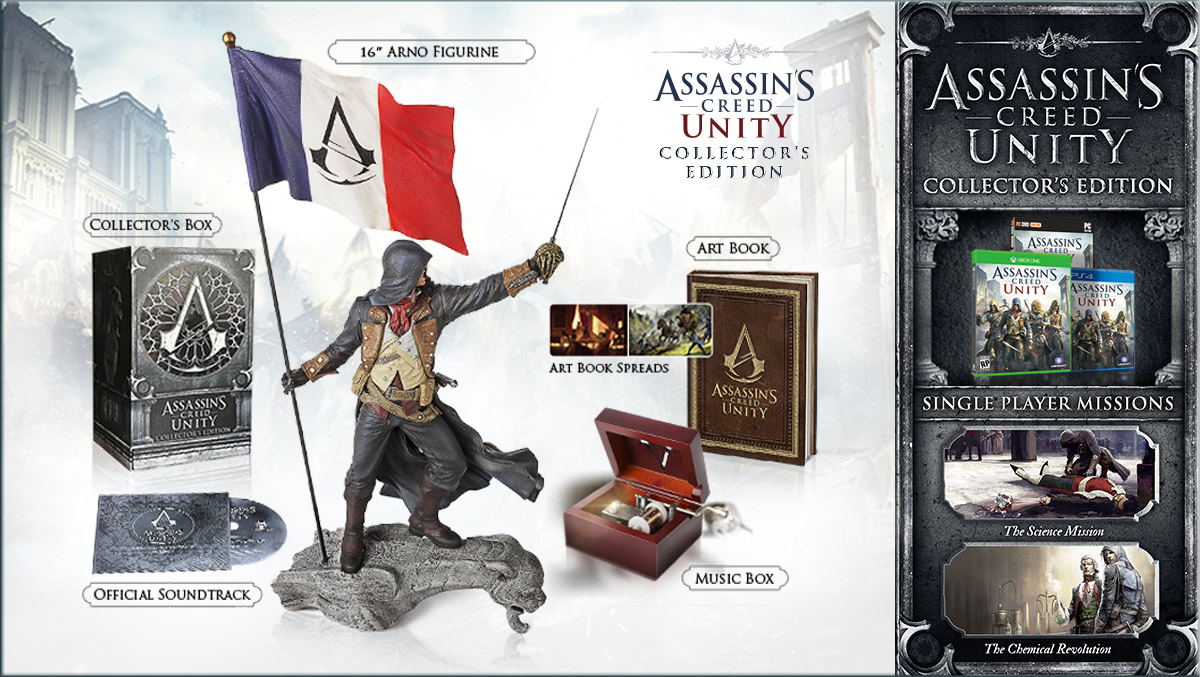 Upravo je izašla vijest o najnovijem nastavku popularnog i dragog nam Assassin’s Creed serijala. Assasin’s Creed Unity izlazi 28.listopada, i to za PS4, Xbox One i PC. Ubisoft je objavio detalje o preorder bonusima, točnije Collector’s Editionu koji sadrži i veliku figuricu (ili kako Ubisoft voli reći, ”statuu”) heroja Arna. Ostale stvari u posebnom izdanju su službeni soundtrack, glazbena kutija, Maple lovačka puška i Under/Over pištolj.