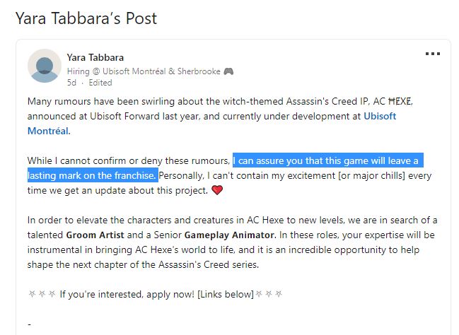 Među čak 11 Assassin’s Creed igara koje su trenutno u razvoju, vjerojatno najviše pažnje privlači ona koja se krije pod radnim nazivom Codename Hexe. Da, to je ona famozna Assassin’s Creed igra čija bi radnja trebala biti smještena u XVI stoljeće te bi se dobrim dijelom trebala baviti progonom vještica. Radi se o ostvarenju na kojem radi Ubisoft Montreal, a na čijem se čalu nalazi Clint Hocking, poznat po radu na igri Watch Dogs Legion. Assassin’s Creed: Codename Hexe bi trebala biti znatno drukčija i dosad najmračnija igra u serijalu, a prema dosadašnjim službenim i neslužbenim informacijama, trebala bi imati i određene horror elemente. Da se doista radi o drukčijoj igri iz ove franšize koja će zasigurno privući veliku pažnju, nagovijestile su i nove informacije sa LinkedIna, objavljene od strane Ubisoft Montrealove regruterke Yare Tabbare.
