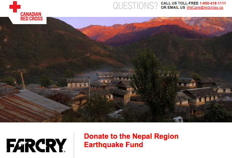 “Nekoliko posljednjih godina proveli smo stvarajući Far Cry 4, igru inspiriranu Nepalom i njegovim žiteljima i s tugom u srcima zbog tragičnog događaja koji je zadesio ovu zemlju, smatramo da smo dužni pomoći kanadskom Crvenom Križu, koji šalje svoj mobilni bolnički tim za Katmandu, kako bi pružili podršku i medicinsku pomoć“, stoji u priopćenju ovog velikog razvojnog tima, objavljenom na stranicama Crvenog Križa.