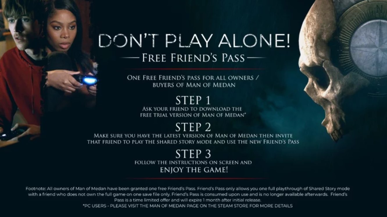 Naime, ukoliko već imate Man of Medan ili ako ga kupite prije 6. siječnja iduće godine, u formi patcha dobit ćete besplatni Friend Pass, s kojim će vam se moći pridružiti i prijatelj koji ne posjeduje igru. Sve što će biti potrebno da igru zaigra s vama, jeste da preuzme besplatnu trial verziju, nakon čega će uz vašu pozivnicu moći da uživa u punoj igri.