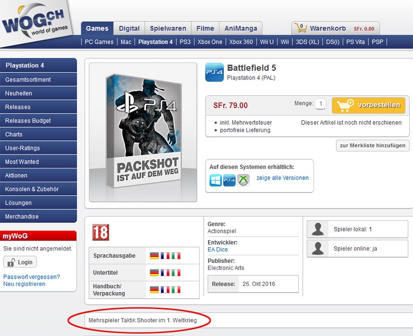 Da, dobro ste pročitali – EA se prvi odvažio svoj veliki serijal poslati malo u prošlost (još uvijek čekamo Activisionov odgovor), a informacije o Battlefieldu 5 pojavile su se na stranicama švicarskog retailera World of Games. Produktna stranica igre, kao što možete vidjeti na screenshotu ispod), sadrži je opis u kojem je jasno navedeno da se radi o multiplayer taktičkog shooteru smještenom u Prvi svjetski rat”, koji bi se u prodaji trebao pojaviti već tijekom listopada (točan navedeni datum je 26. listopada).