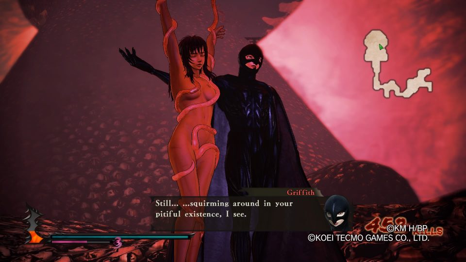 Iako, nisu sve musou igre identične. Određene igre iz žanra (prvo mi pada na pamet primjer igre Attack on Titan i Sengoku Basara) imaju donekle kompleksnije sustave borbe i zahtjevniju mehaniku, ali Berserk poprilično dobro upada u prvotni opis gameplaya koji je, u nedostatku boljeg opisa, najbolje rečeno, ne zahtjevan. Udara se po kvadratu i trokutu i ponekad pritisnete određene gumbove za poseban potez u obliku rage modea – koji se u Berserku zove frenzy mode, sa detaljnijom i posebnom animacijom nakon koje vaš lik postaje još jači. Nažalost, određeni specijalni potezi, unatoč lijepim animacijama ne iskorištavaju sav potencijal što se tiče same mehanike borbe. Unatoč lock-on mogućnosti, određeni specijalni napadi prvenstveno zbog kamere, ograničenosti pokreta na mapi i nešto lošijeg trackinga uništavaju određenu efikasnost koju bi neki potez mogao (i trebao) imati.