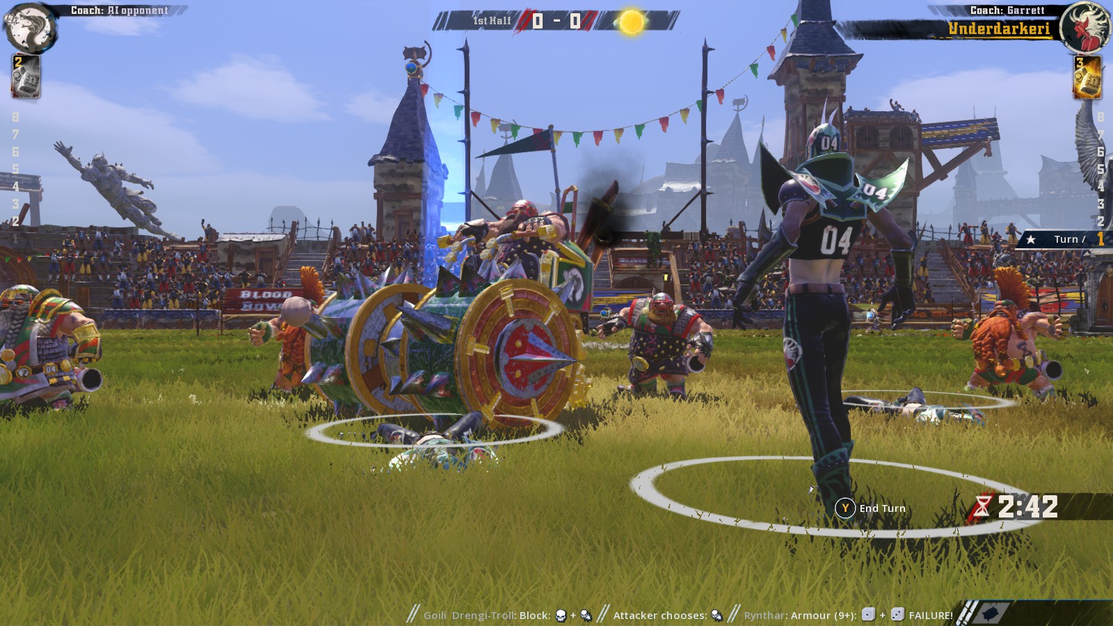 Na početku utakmice se baca novčić i onaj koji dobije može birati hoće li prvi izvoditi loptu (defanziva) ili primati (ofenziva) loptu u svom polju. Prije nego li započne akcija oba trenera pozicioniraju svoju ekipu i raspoređuju igrače po terenu. Nakon ispucavanje lopte akcija može započeti. Dakle, spomenuto je kako je ovo igra na poteze, što znači da svaki trener ima određeno vrijeme da odredi koje akcije će izvesti njegovi igrači. Utakmica završava nakon 16 turnova, dakle poluvrijeme je nakon 8. Akcije koje igrači mogu izvesti svode se na blitz (samo jednom po potezu), kretanje, izbjegavanje, dodavanje, support, block, faul itd. Uspješnost svih akcija ovisi o d6 kocki. I kao svako kockanje tu zna proizaći ogroman broj frustracija tijekom igre. To i random događaji poput navijačkih nereda (ulijetanje publike na teren i premlaćivanje random igrača obje ekipe).