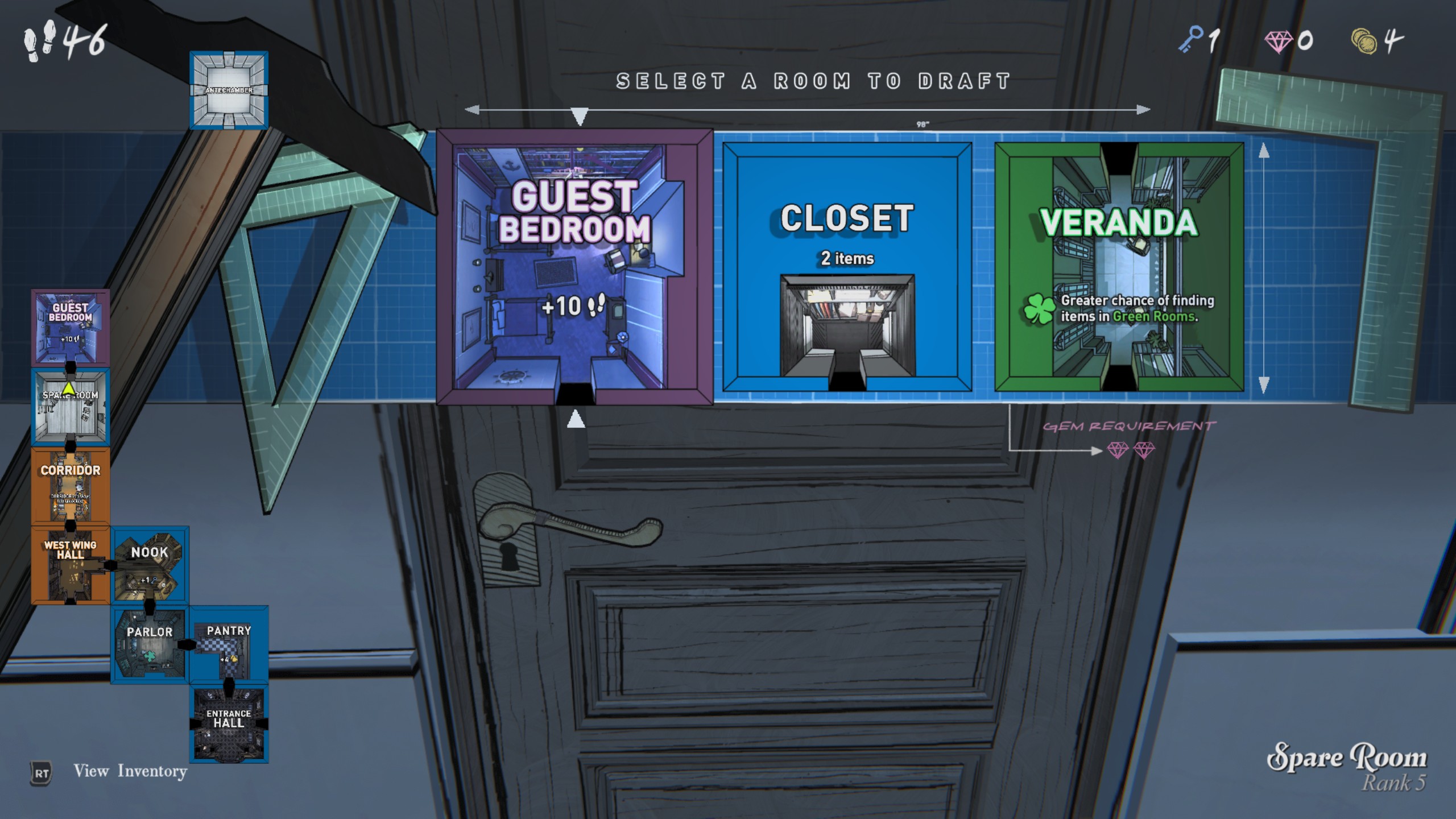 Pametno biranje soba je ključno: hodnici povezuju više izlaza, dok vas sobe bez izlaza poput ormara mogu lako zarobiti ako ih loše postavite. Sobe su označene bojama (zelene = vrtovi, narančaste = hodnici) i imaju različite funkcije, primjerice, nadzorna sigurnosna soba prati predmete, dok kotlovnica mijenja pravila vile. No prekomjerna nasumičnost može se odbiti o glavu – ako se ključevi ili predmeti ne pojave, neki pokušaji jednostavno postanu slijepa ulica, što se događa puno češće nego što biste htjeli.