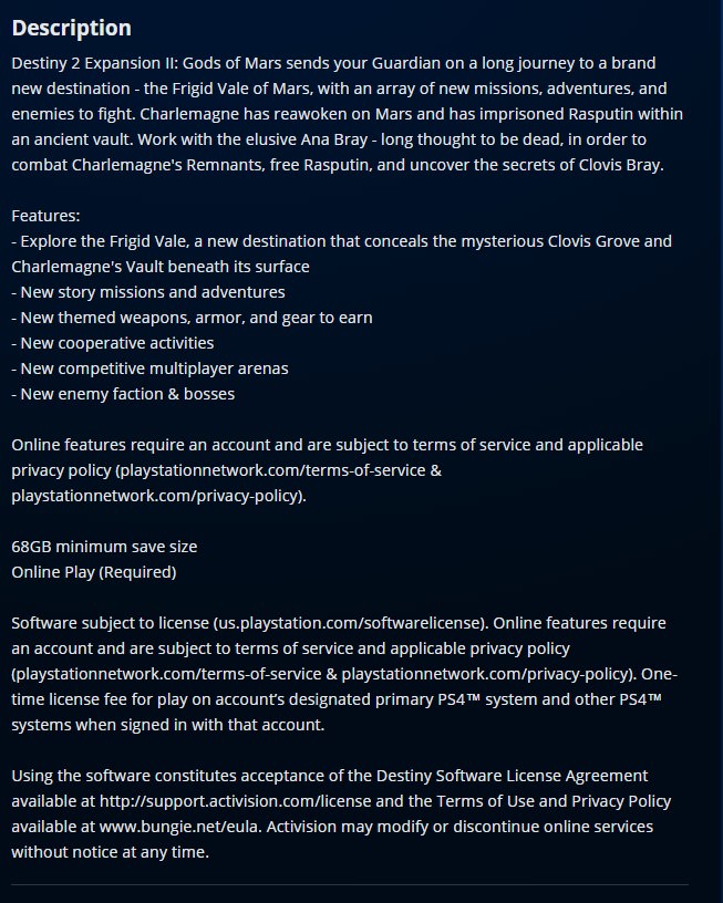 Naime, na sjevernoameričkom i japanskom PlayStation Storeu iscurile su prve informacije o drugoj po redu velikoj ekspanziji za Destiny 2, koja bi trebala nositi naziv Gods of Mars, a koja bi trebala izaći tijekom ožujka.