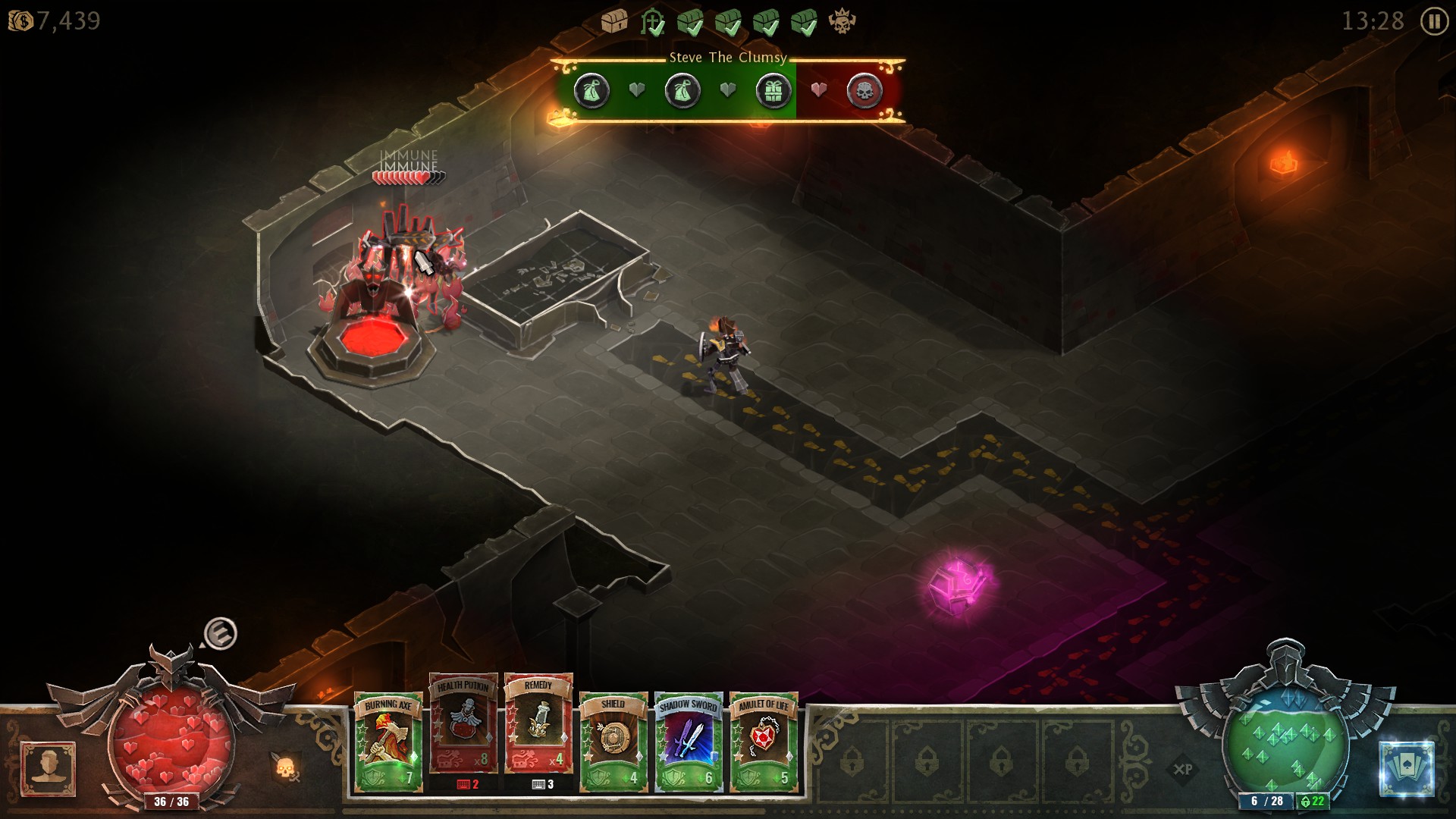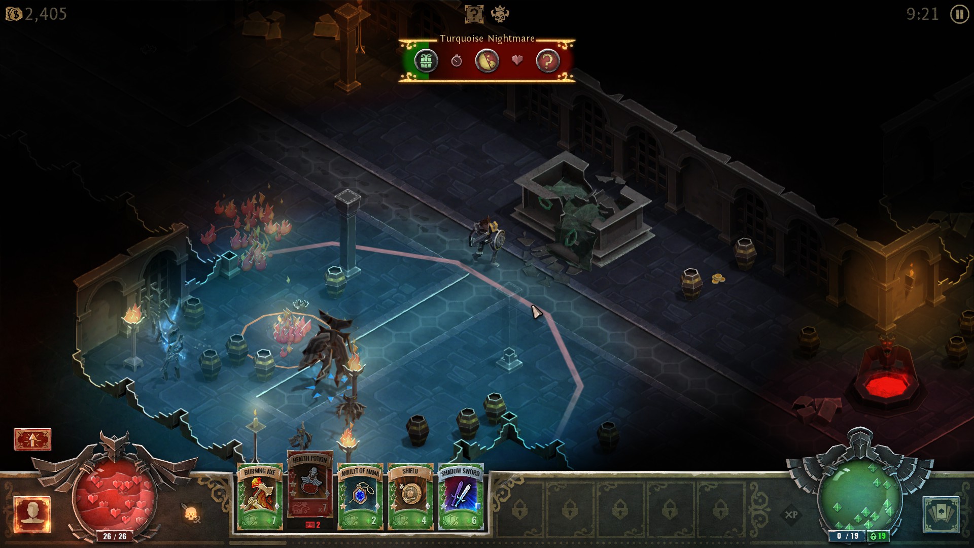 A napasti su raznolike i s dovoljno varijanti da nam otežavaju svaku razinu. Demoni i ostale zle kreature imaju svakakve moći, od teleportacije, preko ošamućivanja do prizivanja dodatnih protivnika. Dubina i raznolikost protivnika dovoljno je razrađena i balansirana. Na dubljim razinama nalazit ćemo se u situacijama gdje ćemo morati pomno birati koje protivnike ćemo prve eliminirati kako bi borba bila što lakša. Protivnici će na sebi često imati i dodatni štit koji se mora uništiti kako bi im napravili pravu štetu, ili će pak prizivati čaroliju koju ćemo moći prekinuti. Ekran će izgledati dosta kaotično i dosljedno velikim hack’n’slash naslovima. Ali uz pravu postavu karata i pažljive rekacije na događanja tijekom borbe, naš će lik prilično biti u kontroli kroz cijeli rusvaj borbe.