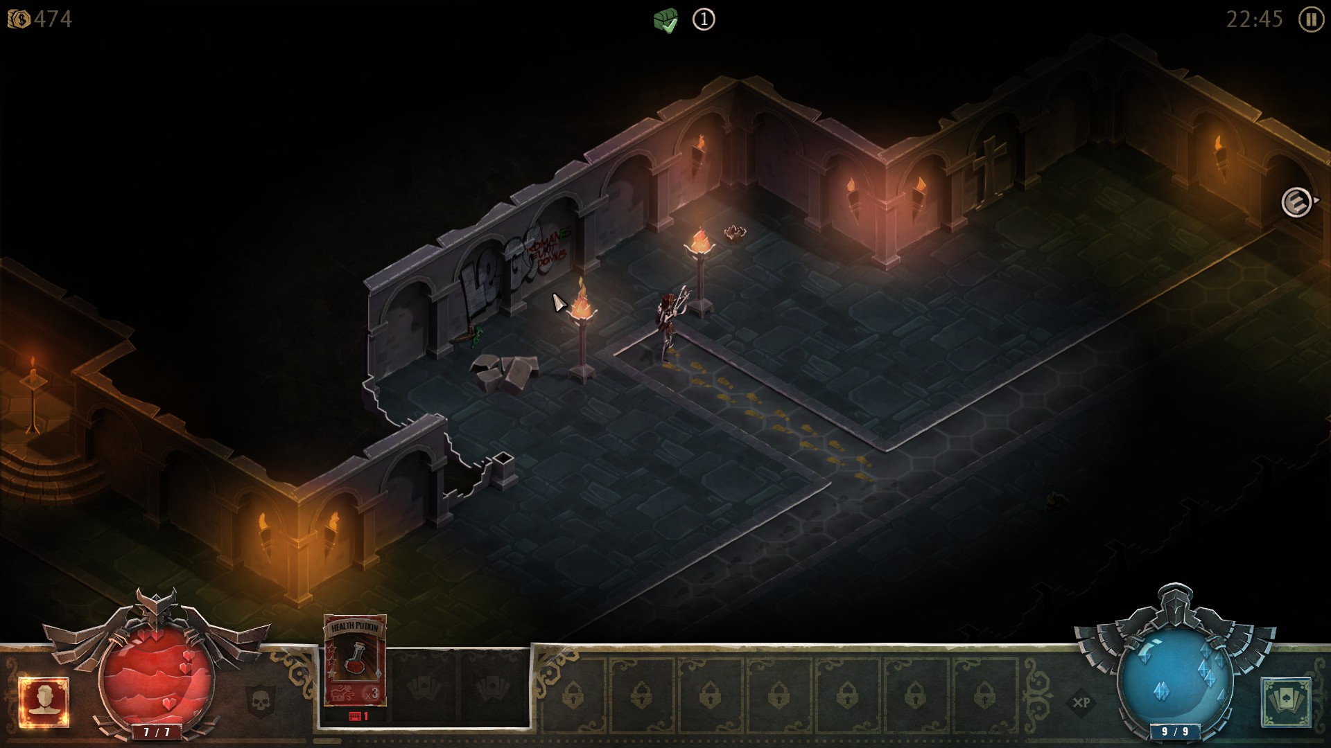 Kako bi uspijeli u poduhvatu morati ćemo se spustiti kroz mnogo razina podjeljenih u tri područja: Labirint, Katakombe i Pakao. Nivoi su proceduralno generirani, iako se to naročito ne osjeća zbog jednostavne estetike i dizajna predložaka koji se generiraju. Na kraju svakog područja, odnosno zadatka, nalazi se glavni šef. Labirint završavamo s The Cookom, Katakombe s Antipapom i Pakao s Archdemonom. Svaki šef ima svoju malenu „predigru“ s kojom nam otežava situaciju prije sukoba s njima. Npr. Antipapa će nam oduzeti sve karte iz špila i pobacati ih po nivou, tako da ćemo ih morati ponovno sve prikupljati. Uz tri glavna šefa, kroz razine pojavljuju se i manji šefovi koji će imati svojstvene sposobnosti i raznolike mehanike borbe.