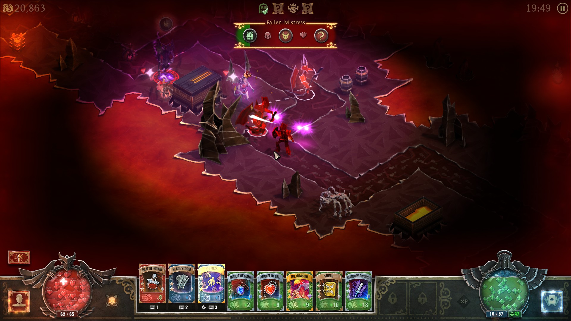 Spomenute mogućnosti se unutar gameplaya izražavaju kartama podijeljenih u tri kategorije – predmeti, vještine i čarolije. U startu imamo samo četiri mjesta za karte, ali možemo kupovati i otključavati dodatna mjesta do ukupno deset karata koje možemo koristiti iz špila. Karte skupljamo kao dio generiranog lootanja kroz prolaske nivoa i možemo ih nadograđivati pomoću „rune“ karata. Također, karte mogu imati i vlastite varijacije kao i posebna djelovanja u kombinaciji s drugim kartama ukoliko su opremljene. Implementaciju ovakvog sistema mehanike s kartama u hack ‘n’ slash okruženju Book of Demons izvršava sposobno i zadovoljavajuće. Lakoća i jednostavnost s kojom se karte kontroliraju i mogu izmjenjivati, konstantno nam daje mogućnosti da se prilagođavamo generiranom nivou i mijenjamo način igranja po potrebi. Hoćemo li luđački bacati bombe s različitim vrstama oštečenja, ili ćemo se opremiti oklopom i poput tenka primati udarce dok se rješavamo svake napasti koja nas okružuje, ili oboje.