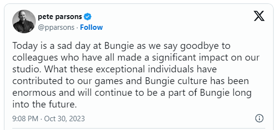 Naravno, ništa od gore napisanog ne znači da su Destiny igre loše. Upravo suprotno, u globalu radi se o zaista zabavnom “svemiru” sa sjajnim gameplayem i u velikoj većini zanimljivim loreom koji ga okružuje. Ono što “ubija” jesu cifre koje su ulupane u razvoj i očigledni nesrazmjer uloženog-dobivenog. Na koji način je Bungie uspio uvjeriti Sony da vrijede više od tri i pol milijarde dolara ostaje jedan od većih misterija. Bungie kao tvrtka nije dioničarsko društvo, tako da je procjena vrijednosti morala doći od nekog eksperta po svemu sudeći upitnih kompetencija. Neće nas začuditi ako ova transakcija i njen epilog budu uskoro dio nekakve studije nekog od velebnih ekonomskih sveučilišta diljem globusa. Bungiev CEO, Pete Parsons je na Twitteru stavio kratki post u kojem je jako tužan zbog otkaza koje je uručio kolegama i da se radi o iznimnim pojedincima koji su napravili veliki doprinos Bungie kulturi i da će njihovo nasljeđe biti dio Bungie dugo u budućnost. Ne znamo kako vi doživljavate ovaj posto, ali nama je prilično ciničan.