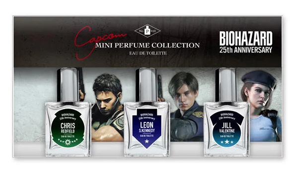Resident Evil parfemi dolaze u tri mirisa, svaki popraćen jednim od likova iz igre, pa su tako na parfemima Leon S. Kennedy, Jill Valentine i Crhis Redfield. Parfemi su zasad dostupni samo u Japanu i to u Capcomovom dućanu na webu, a potvrde dolaska ovih parfema izvan Japana još nema.