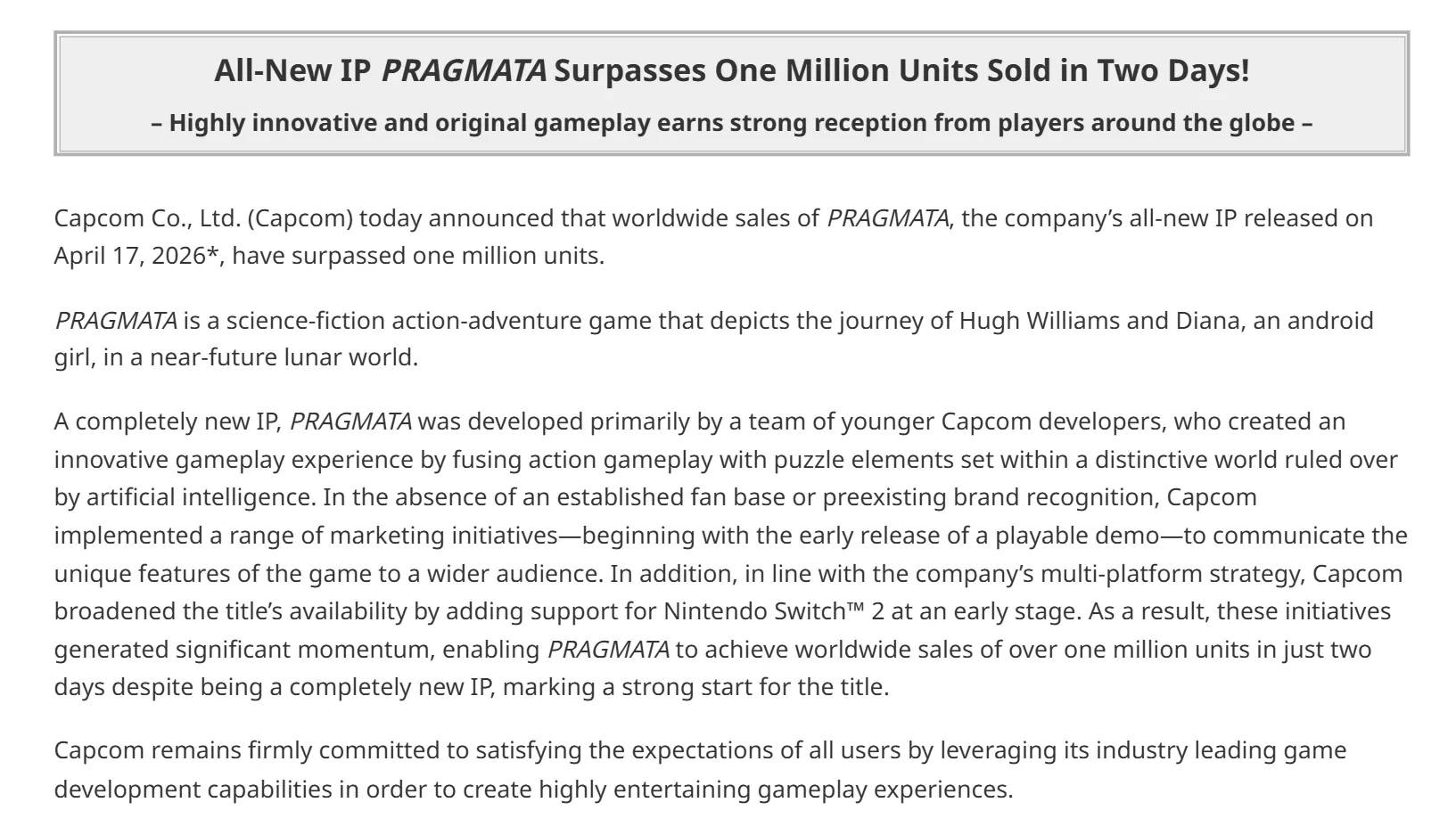 Prema službenim podacima koje je Capcom objavio, PRAGMATA je premašila milijun prodanih primjeraka u svega dva dana prodaje. Ovaj uspjeh dobiva još više na težini kada se uzme u obzir da igra trenutno nije dostupna na Nintendo Switch 2 konzolama u Japanu, što je tržište na kojem Capcom tradicionalno dominira.