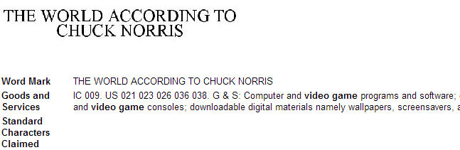 Zanimljiv trademark se pojavio u Sjedinjenim Američkim Državama. Legendarni Chuck Norris osobno je ispunio zahtjev za registraciju projekta pod imenom The World According to Chuck Norris.