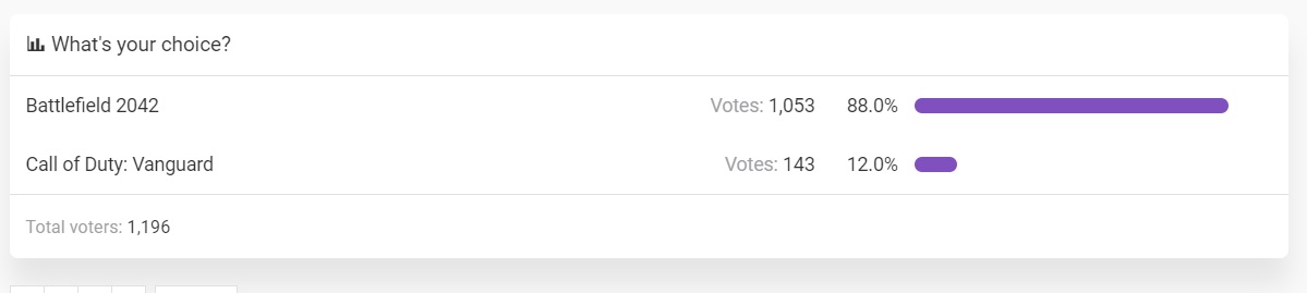 Većina je svoj glas odlučila dati Battlefieldu 2042, jer vjeruje da će im EA dati “ono nešto”, te da neće biti mjesta za kompromis. Drugi su pak svoj glas podali Vanguardu, jer se raduju kampanji za jednog igrača, ali ne računaju na inovacije kada je u pitanju online komponenta.