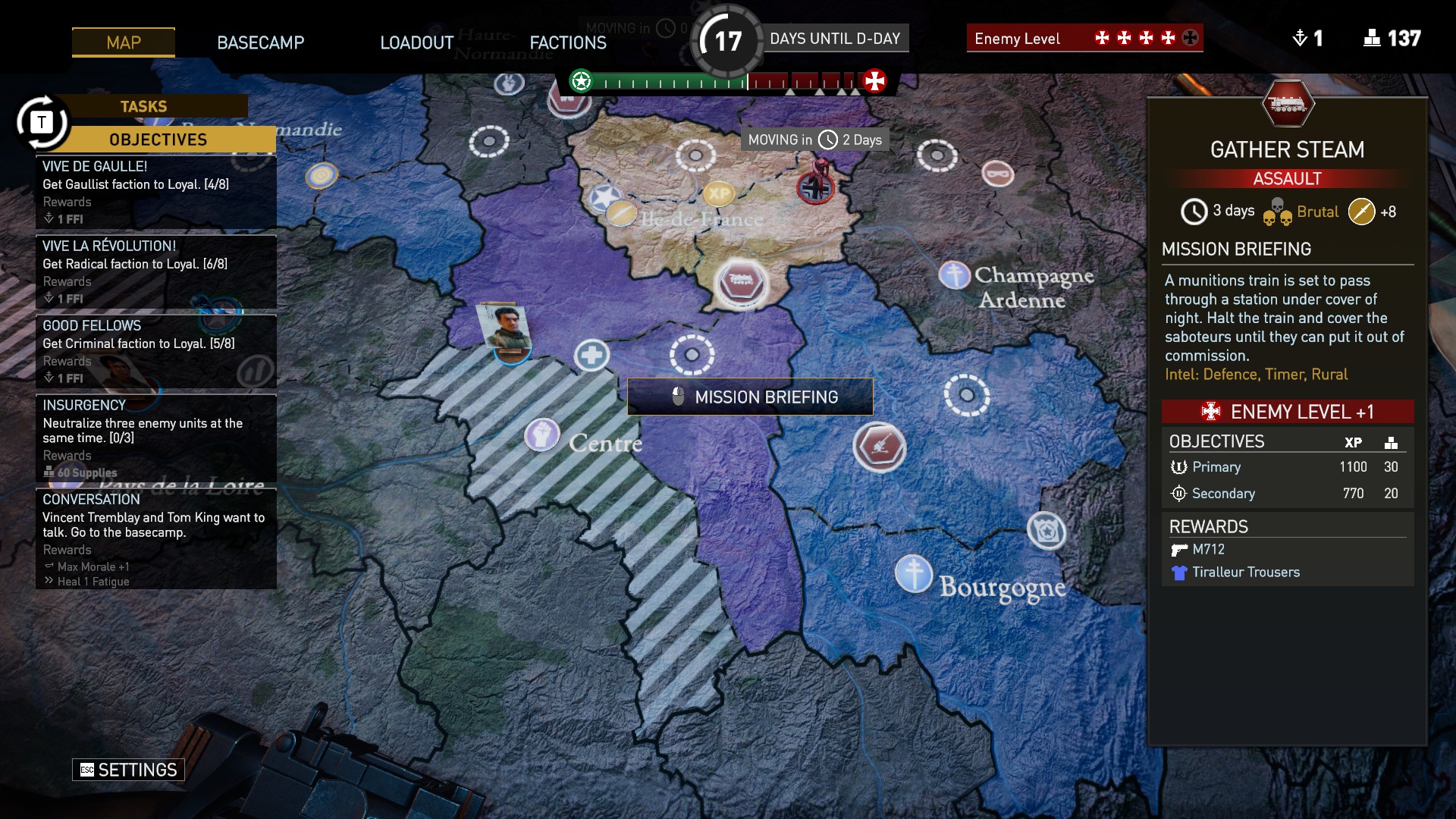 Tijekom igranja kampanje, suočit ćete se s neprijateljskim jedinicama poput Gestapa ili raznim generalima na karti, koji će nastojati spriječiti vaše osvajanje provincija, odnosno kretat će se s jedne provincije na drugu. Naime, svaka provincija donosi određeni broj bodova, neke su kritične za uspjeh, neke manje, ali svaka donosi posebne bonuse. Ti bonusi uključuju dobivanje dodatnih resursa tijekom izvođenja misija ili mogu utjecati na izvođenje Dana D. Igra vam omogućuje da nadoknadite neuspjehe putem obavljanja različitih sporednih misija sa svojim likovima. Na primjer, možete regrutirati specijalne agente koji će zaustaviti aktivnosti neprijateljskih jedinica, poboljšati odnose s frakcijama ili jednostavno trenirati svoje likove. Sve te misije zahtijevaju resurse, koje dobivate uspješnim završavanjem zadataka. Misije imaju ocjene i glavne i sporedne zadatke, a što ste uspješniji, to ćete više nagrada dobiti.