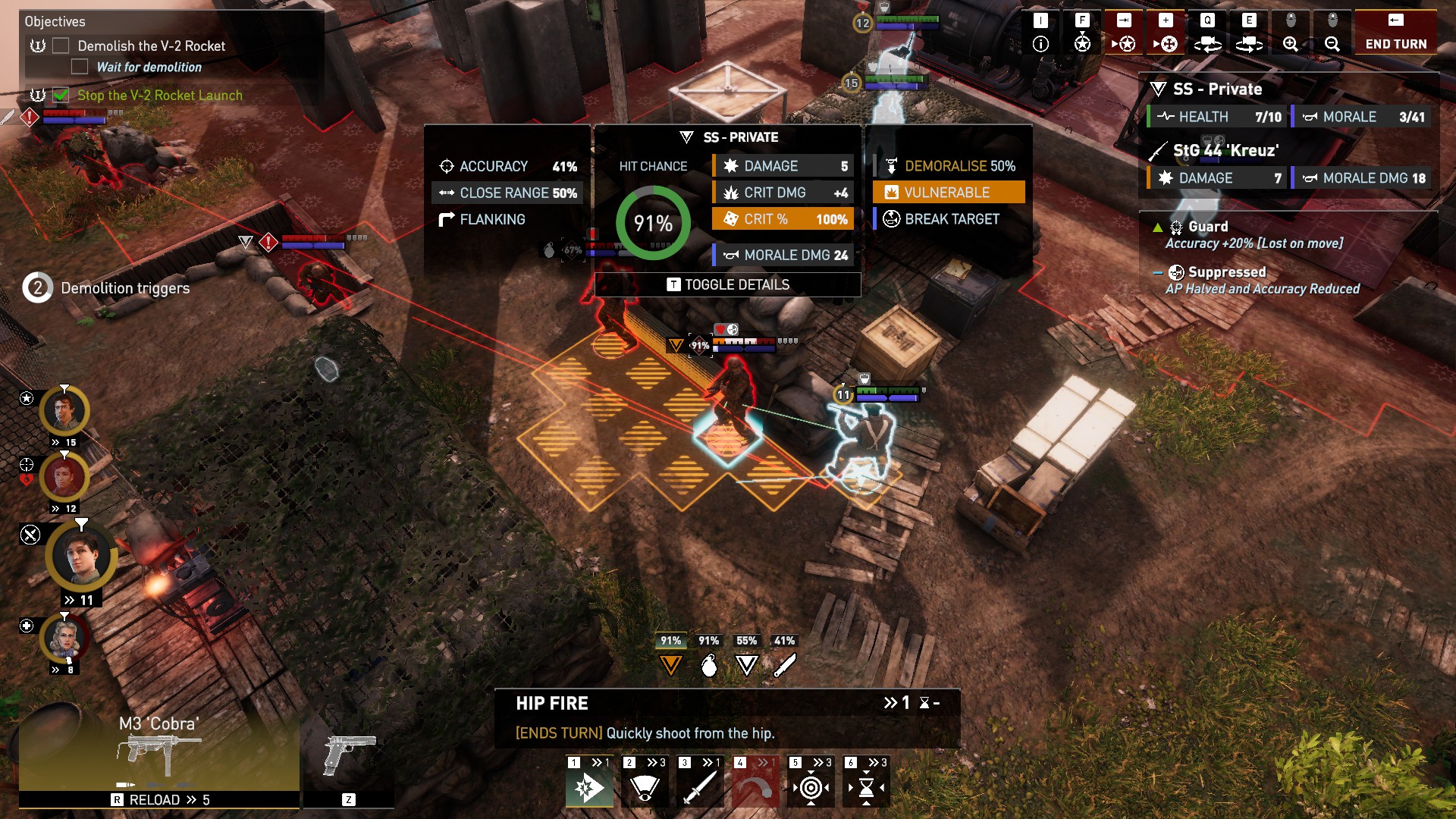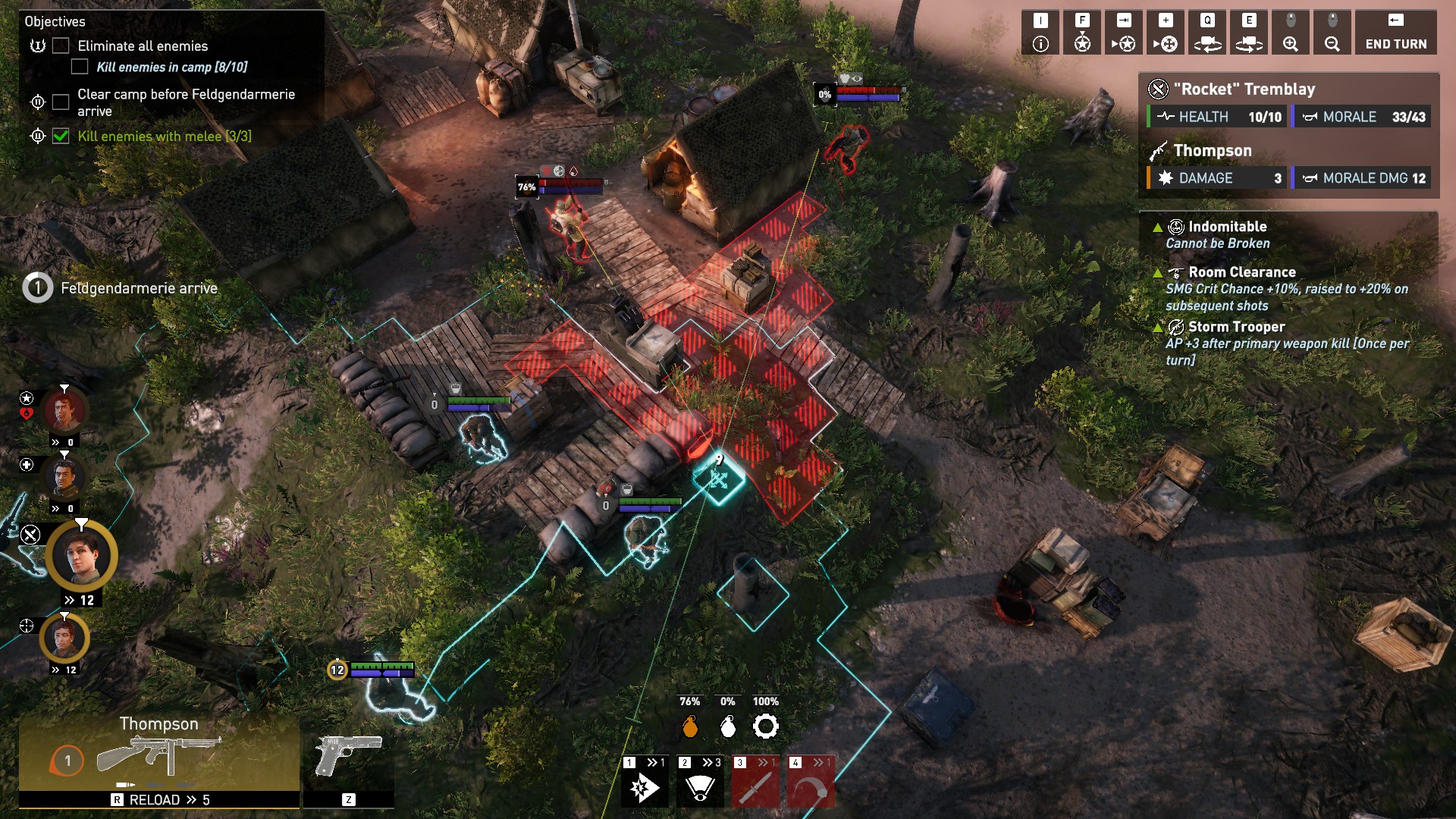 Nakon eliminacije prvog vala neprijatelja, pojačanja će uvijek stizati s precizno određenih lokacija. Možete koristiti Overwatch alat koji omogućuje pucanje na prvu metu koja uđe u vaš nišan, ili jednostavno baciti granate kako biste zahvatili veći broj neprijatelja. Osim toga, možete pucati na eksplodirajuće bačve i automobile koji, kada se unište, daju određenu štetu. Pojačanja koja se pojave ne napadaju odmah, već tek nakon drugog poteza. Svako kretanje, napad, punjenje oružja i korištenje vještina troši određeni broj akcijskih bodova, što naglašava određena ograničenja koja zahtijevaju oprezno planiranje unaprijed.