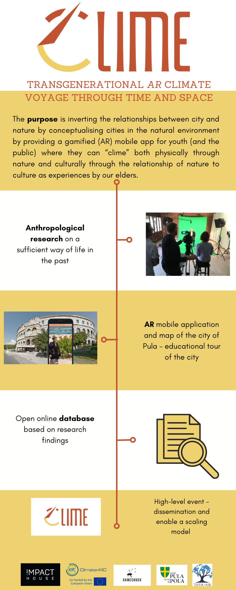 “Clime” – klimatske priče iz davnina društvena je inovacije tvrtke Impact House koja kombinira antropološko istraživanje o korištenju reursa, odnosu prema moru, otpadu i klimi, te iskustvu klimatskih promjena tijekom više od 90 godina života građana i građanki Pule. Živimo u doba kada je transgeneracijsko prenošenje znanja, vještina i iskustva vrlo ograničeno zbog smanjene komunikacije među generacijama, no s druge strane, ono se postavlja kao ključ današnjih klimatskih promjena tijekom, budući da prošle generacije ostavljaju mladima u nasljeđe prirodu i klimu u alarmantnom stanju. Stoga inovacija – aplikacija Clime koristi tehnologiju proširene stvarnosti (AR) kako bi ponovno povezala generacije. Uz pomoć naših mobitela putujemo kroz vrijeme, jezik i kulturu kako bi uspostaviti neobičan dijalog o korištenju resursa, klimi i prirodi sa starosjediocima mjesta kojeg posjećujemo.