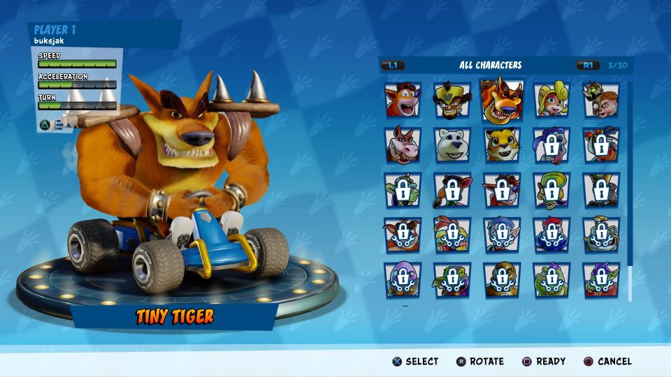 Svi dragi nam likovi su tu, a neke dobivamo kroz igranje igre i tako ”punimo” roster do zavidnog broja sa likovima koje dosad nismo ni bili u mogućnosti zaigrati (više o tome u okviru ispod). Kroz Adventure mode imamo posebne boss bitke, Ripper Roo i mnogi drugi donose posebne utrke sa svojim posebnim preprekama i unose dinamičnost u obične 4 utrke po svakom svijetu, te nakon pobjede nad njima dobivamo i njih kao igrive likove. Lijepi detalj su svakako staze iz prijašnje dvije igre, koje su ovdje ne samo vizualno usavršene, nego neke su malo i ispravljene, učinjene zanimljivijima, a na nekima su prijašnji prečaci ukinuti. Primjerice, Hot Air Skyway je staza koja je imala jedan dosta jak prečac, no sada je on pregrađen ogradom preko koje se ipak ne može. Takvi detalji izazivaju smiješak na lice, ali i ukazuju na temeljitost Beenoxa pri izradi ovoga remakea koji se, prema mnogim takvim aspektima, čini kao sasvim nova igra. Ono što je najveća novost s obzirom original(e) jest mogućnost uređivanja vašeg vozila, kao i osvajanje raznih dijelova vozila i poboljšavanje performansi. Nitro-Fueled tu donosi puno dodataka kozmetičke naravi, a i promjene bolida i guma koje zaista omogućuju da vaše vozila malo i napreduje u samim trkama. Ovaj novitet je dosta user-friendly, te je prilagođen mlađim pridošlicama u serijal, kao i svima nama koji smo igrali prvu igru i nostalgično gledamo na ove likove i primamljiv gameplay. Ono gdje bi, ipak, mlađe pridošlice mogle imati problema, je single player koji je (kao što je već spomenuto) dosta težak i za starije i iskusnije, a kamoli ne za njih.