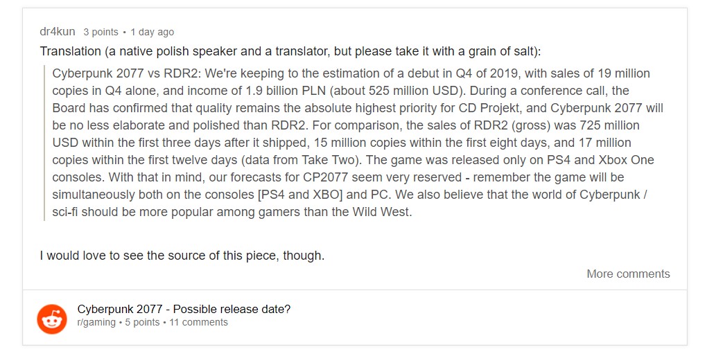 Izvještaj koji je s poljskog jezika preveo Reddit korisnik dr4kun, pravi usporedbu Cyberpunka 2077 s Red Dead Redemptionom 2 te predviđa izlazak igre tijekom četvrtog kvartala fiskalne 2019. godine – dakle, u periodu od 1. siječnja do 31. ožujka 2020 godine.