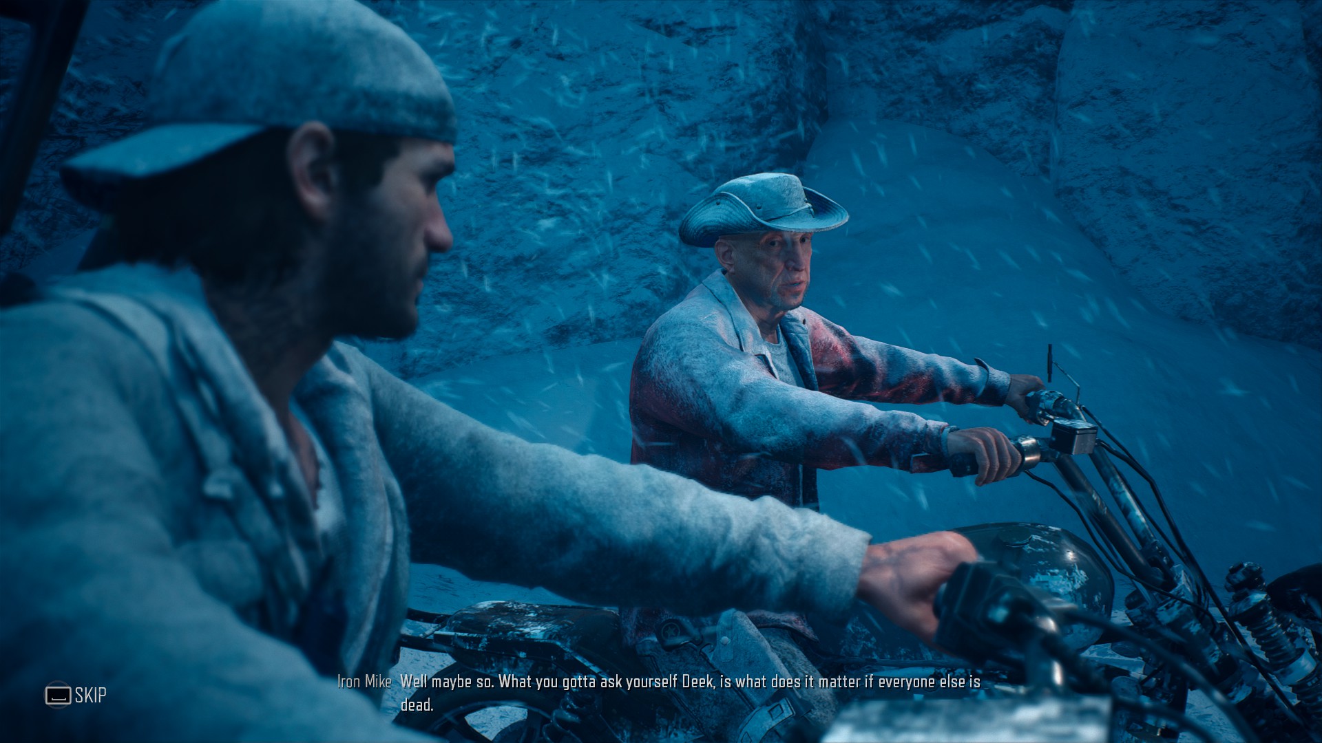 Ukoliko niste već igrali Days Gone, možete steći dojam da se ovdje radi o poprilično klasičnoj i stereotipnoj postapokaliptičnoj priči. Nema smisla ju cijelu prepričavati, iako bi se realno mogla ispričati do kraja ovog teksta. Da se razumijemo, priča Days Gona uopće nije loša, možda je samo malo kilavo prezentirana, no pokušat ću to objasniti detaljnije kroz sve aspekte igre. Cijela igra i napredovanje je razlomljeno na hrpu manjih takozvanih storylineova koji prate određenu temu ili priču vezanu za događaje i pojedine karaktere igre. Svaki storyline ima određeni broj misija u sebi koje se nekad daju rješavati nasumičnim putem kako bi se stvorio dojam nelinearne priče. Također, pojedini storylineovi se isprepliču u svojevrsnu mrežu i utječu jedan na drugi na način da se sa određenom misijom pravi progres u više storylineova. Ovakav pristup u teoriji zvuči odlično, možete odabrati što vas zanima i rješavati igru putem kojim vi želite. Međutim, teorija je jedno, praksa je drugo, te iako je ovakav storytelling dobar, developer jednostavno nije uspio izvesti što je zamislio. Naime, određene misije iz krucijalnih storylineova se neće aktivirati ako prethodno nisu rješene neke totalno random “prošetaj se kroz kamp” misije od prije 3 sata igranja, koje ste vi naravno zaobišli jer ste imali tu mogućnost, ali nema dalje dok se sve ne rješi. U igri se dakle događa da prekidate totalno interesantnu akciju i vraćate se natrag kako bi se bavili za tu priču nebitnim stvarima. Rezultat svega je linearnost, a apsurdno je da je ona postignuta nelinearnom slobodom. Igru sam prešao za nepunih 38 sati igranja, što je relativno puno ukoliko je taj način nažalost bezveznjikav. Priča realno traje upola kraće, no zbog čudnog razvlačenja ona se čini naporno preduga. Čitao sam komentare na netu kako je priča na početku dosadna i spora i može natjerati igrače da odustanu od igranja. Da budem jasan, nemam ništa protiv od toga da me “open world” igra na početku uči lovu na jelene, skupljanju materijala, kraftanju raznih oružja i itema za igru, da dobijam razne sitne poslove čija je svrha skupljanje iskustva i resursa, isprepletenu naravno sa ugodnim storytellingom. Days Gone kako sam odmah na početku rekao uopće nema lošu, a ni dosadnu priču, ali se zbog gore spomenutog preklapanja više storylineova događa da od bitnih rješite tek početak, a već ste u preko 25 sati igranja. Odjednom u nekom trenutku igra kao da odluči da je vrijeme za dalje i onda vas izbombardira sa velikom količinom priče koja se mogla prepričati u normalnim intervalima. Na kraju 90% priče progutate u posljednjoj četvrtini igre.