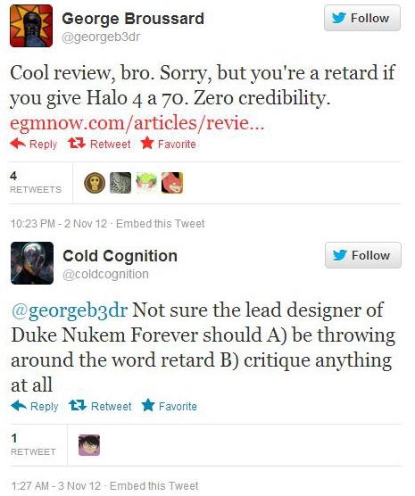 Kritika je svakako nešto što treba gaming industriji pa i gaming novinarima koji dijele kritike. Radilo se o IGN-u, nekom časopisu, GoodGameu ili blogeru sa osobnom stranicom gdje recenzira i piše o igrama. Tu ponajprije mislimo na konstruktivnu kritiku. No, unatoč tim željama, u raznim komentarima diljem svijeta, društvenih mreža i portala možemo naići na puno fan boy bijesa ili jednostavno ne previše složenih rečenica raznih individua koji se pokušavaju suprotstavljati konkretnijim kritikama neke igre. Sve je to nekako već smatrano očekivanim, no kad se relativno javna osoba koja radi u kreiranju raznih video-igara uplete u reagiranje na kritike na dosta neragumentirani način, onda ipak postaje problematično. Electronic Gaming Monthly je nedavno dao jednu od slabijih ocjena novom Halo naslovu, 7/10, a prozvanim se osjećao lik koji očito voli novi Halo, no nema nikakve prevelike veze s njom. Radi se o George Broussardu, glavnom dizajneru neuspješne igre Duke Nukem Forever koja je bila “samljevena” od strane većine recenzenata.