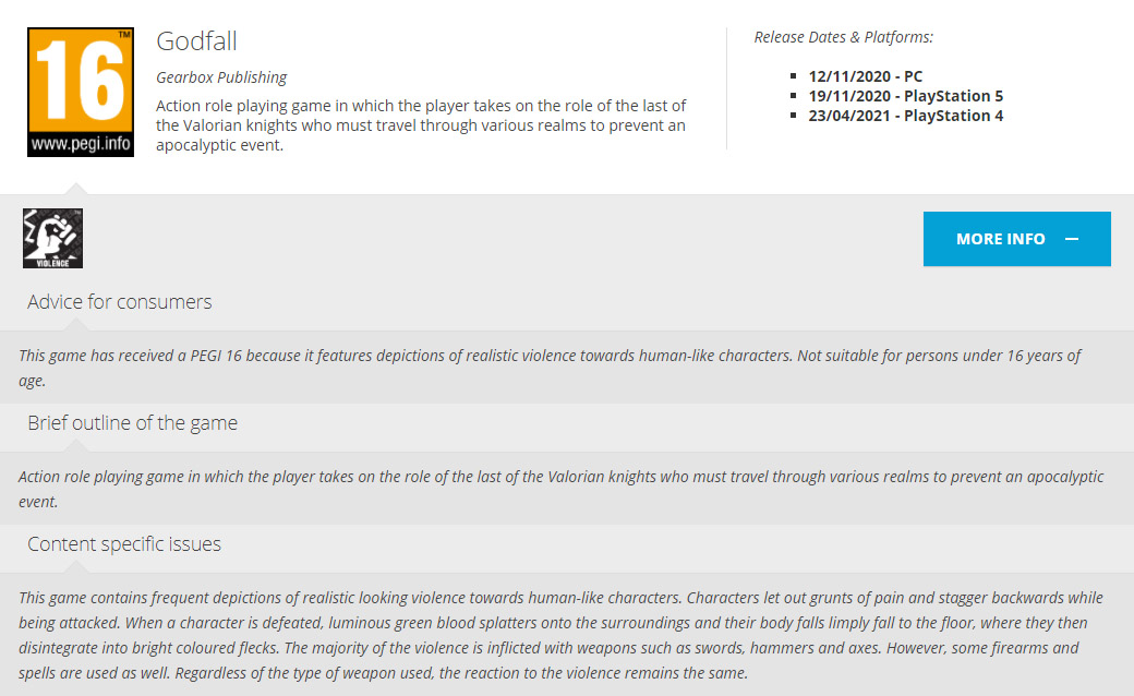 Naime, PEGI je objavio rating za navedenu igru, pri čemu je kao datum izlaska 23. travanj. Taj datum je već iza nas, što pomalo izaziva sumnju u cijelu situaciju, budući da Godfall još nije stigao na Sonyjevu last-gen konzolu. Naravno, moguće je da se navedeni datum odnosi na datum objavljivanja ratinga, iako jasno stoji da su u pitanju datumi izlaska, koji se podudaraju sa datumima kada su se u prodaji pojavile PS5 i PC verzije.