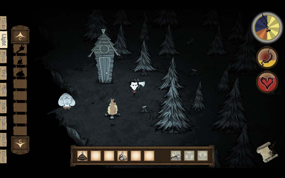 Dosta plakanja, plakanje je za pizdice. Prvo što treba napraviti, kako nam je misteriozan gospon rekao, je prikupiti nešto za jelo. Nakon kraćeg trčkaranja uokolo pronalazite prvo grmlje s kojeg se može pobrati bobičasto voće koje će vam u početku biti dobar izvor hrane i rekao bi „besplatan“ jer vam za prikupljanje istog ne treba nikakav alat. Osim toga, bitno je skupiti i nešto grančica i granja s poda, jer drvo naravno ne možete sjeći rukama (fuck you minecraft), te naći koji komad kremena s kojim ćete to granje zapaliti i napraviti si malu vatricu koja će vam biti jedini prijatelj tijekom noći. Noć je mračna, vjerujte mi, brzo dolazi i dugo traje. Jedina okupacija na početku vam je osigurati izvor svijetla, vatru, a nakon prve noći (ili ako ste spretan igrač pa da odmah mislite na to), sklepati koju sjekiru i poubijati što je više moguće stabala kako bi u istu tu vatru imali što dodavati da se ne ugasi. Kada se dan počinje gasiti i kada padne suton, najbolje je odmah krenuti prema mjestu koje ste odredili za kamp, postaviti vatru, sjesti i čekati. Zašto? Zato što kad prođe sumrak i kad padne noć, vaš vidokrug se smanjuje i jedino što vidite je uski prostor oko vatre u centru ekrana. Nema više mrdanja, odlazak izvan granice svijetla u „pitch black“ znači brzu i brutalnu smrt jer u mraku vrebaju razne beštije i babaroge, te tko zna kakve sve prikaze. Zanimljivo je da ih nikada nećete vidjeti, jer su u mraku, logično, ali zato ćete ih itekako dobro čuti. I to će vas izluđivati.