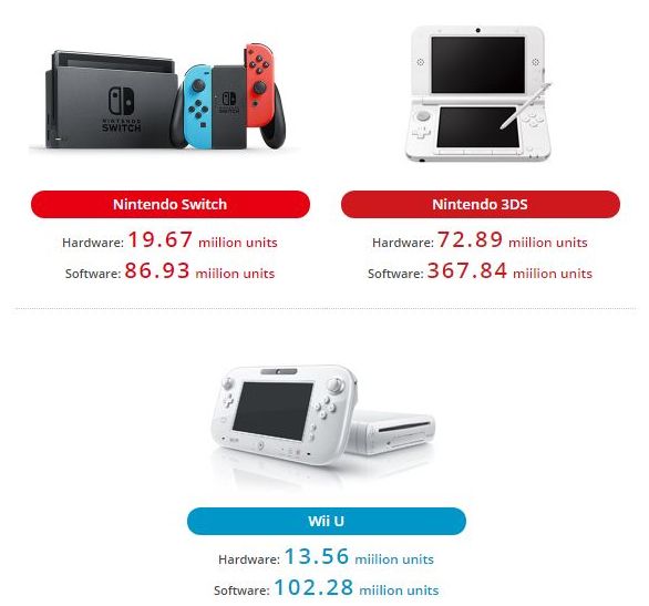Tako smo doznali da je dosad isporučeno 19,67 milijuna Nintendo Switch konzola (tijekom posljednjeg kvartala, cifra isporučenih konzola iznosi1,88 milijuna), dok 3DS konzola (svih varijacija) isporučeno 72,89 milijuna. Kada je u pitanju prodaja softvera za navedene konzole, dosad je ukupno isporučeno 86,93 milijuna Switch igara, odnosno 367,84 milijuna 3DS igara.