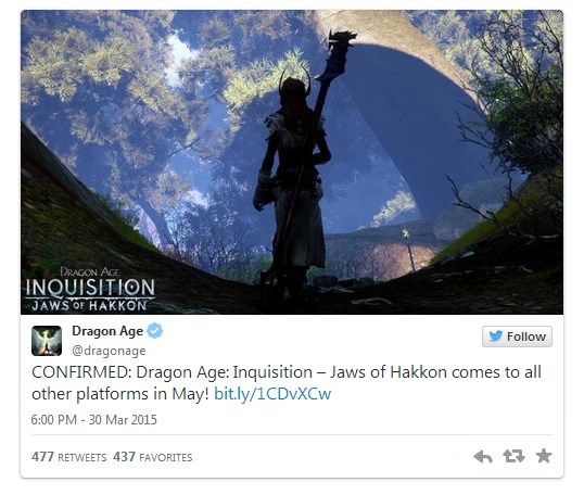 BioWare je putem službenog Dragon Age Twitter accounta otkrio da će se spomenuti DLC na Xbox 360, PS3, PS4 i PC plaftormama pojaviti tokom svibnja te da će ga biti moguće kupiti po cijeni od $14.99.