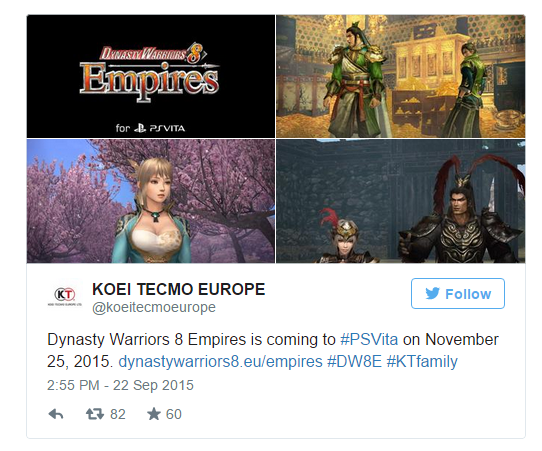 Dynasty Warriors 8 Empires, najnovije izdanje dugogodišnjeg Dynasty Warriors serijala, koje je ranije ove godine izašlo na PS3, PS4 i Xbox One konzolama, uskoro bi trebalo stići i na PS Vitu.