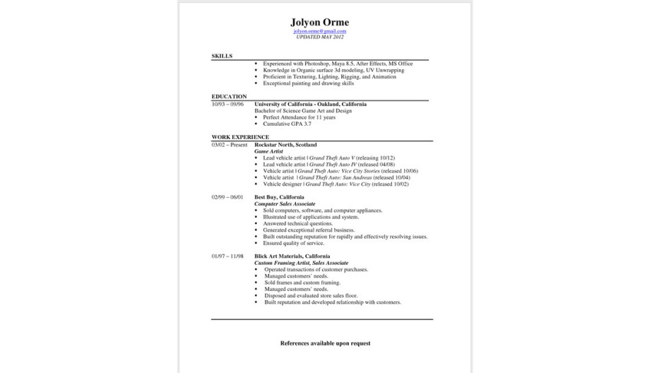 Ovaj CV kojeg je objavio GTANetwork (preko OXM stranice) pripada Jolyon Ormu, glavnom dizajneru vozila u igri. Orme je drugi zaposlenik Rockstara koji je naveo listopad kao datum izlaska igre. Prvi takav CV je izašao još u travnju, a bio je od zaposlenika Alxa O’Dwyera, animatora koji je radio na igri.