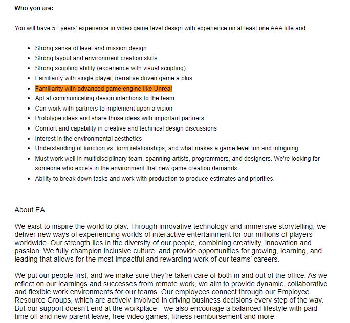 Sudeći prema oglasu za posao, u kojem EA Motive traga za senior level dizajnerom, Iron Man igru bi mogao pokretati Unreal Engine, odnosno najvjerojatnije njegova nova, peta po redu edicija.