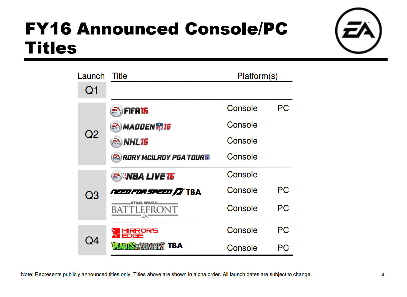 U svome izvještaju za dioničare, Electronic Arts je objavio termine izlaska nadolazećih najavljenih naslova. Otkriveno je kako će Mirror’s Edge reboot i nova Plants vs. Zombies igra u prodaju stići najraniji u prvom kvartalu 2016. godine. Od ostalih zanimljivih naslova, novi Need for Speed je predviđen krajem ove godine.