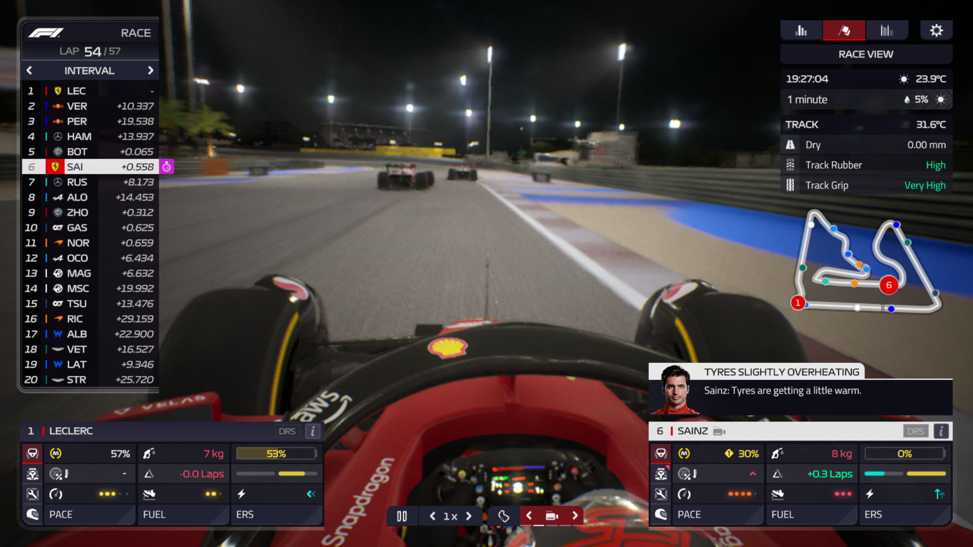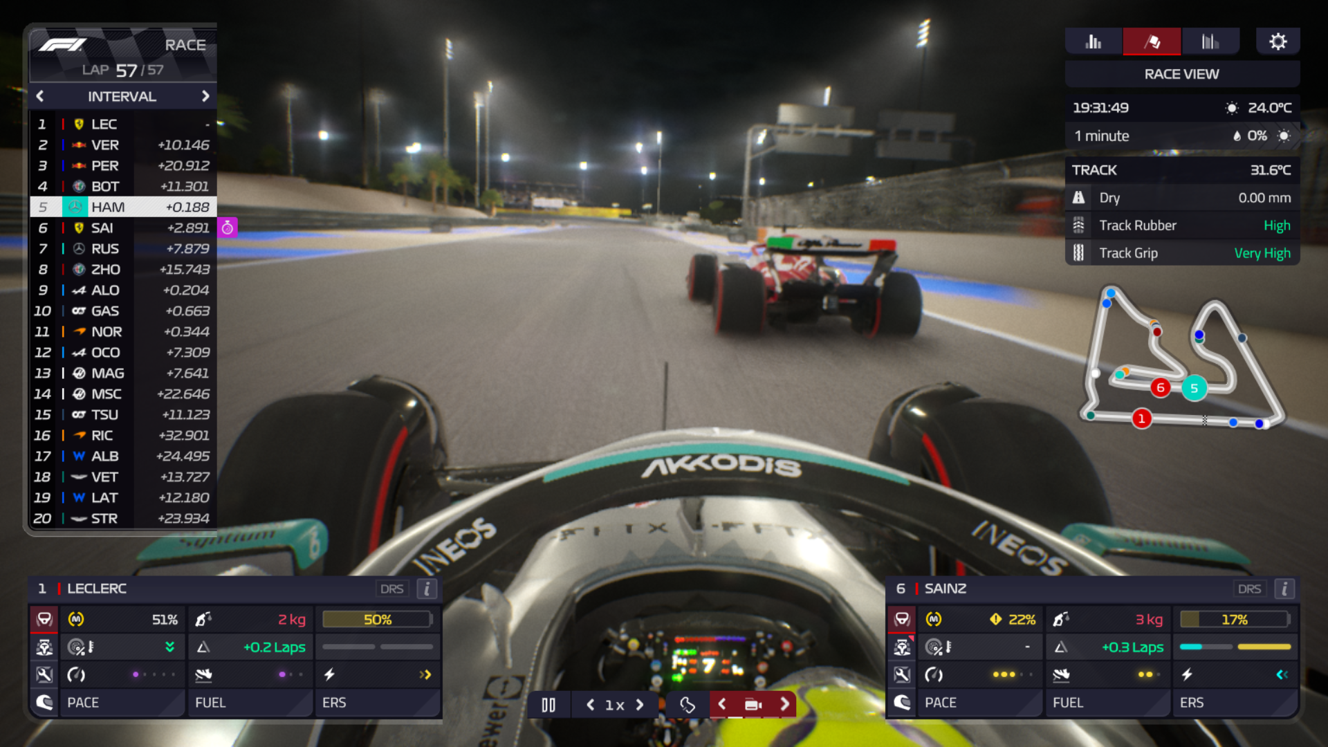 Najveći problem trkaćeg dijela je predvidivost protivnika, pa ukoliko zaista razumijete strategije sa gumama, iskustvo utrkivanja će biti osakaćeno. Ukoliko su uvjeti na stazi optimalni, AI jednostavno ne reagira na trenutne parametre i tvrdoglavo se drži svoje zacrtane strategije s početka. To je veliki minus, jer je upravo čar Formule 1 nadmudrivanje sa protivnicima, različiti pristupi, iznenađenja i td. A budući da je igra single player, ovo se ne može oprostiti.