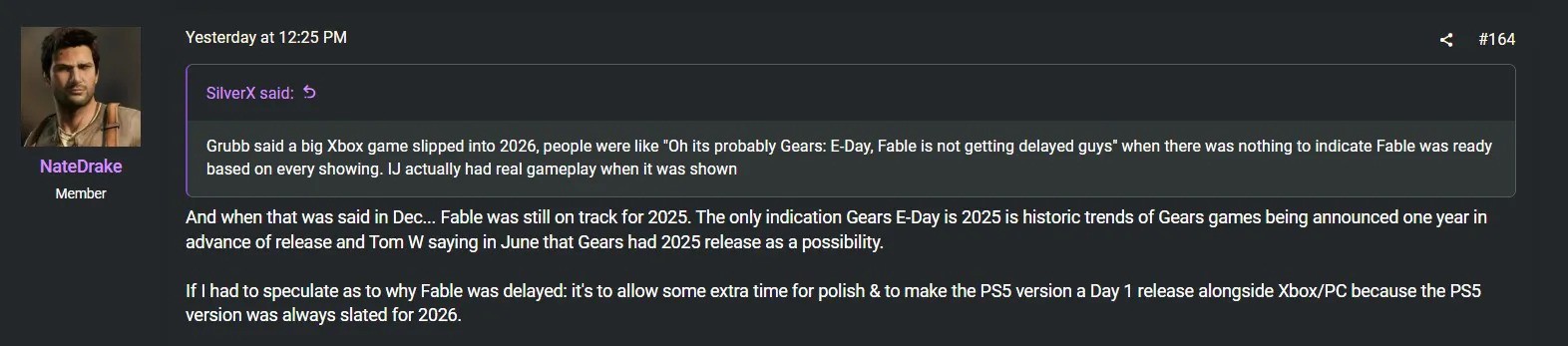 Ipak, nisu svi insajderi jednoglasni. Neki izvori sugeriraju da je odgoda ipak posljedica tehničkih poteškoća. Jedan od vjerodostojnih insidera, eXstas1s, nedavno je izjavio da se mnogi aspekti igre, uključujući sustav napredovanja, temeljito prerađuju. Ovo bi moglo značiti da Fable nije bio spreman za lansman u planiranom roku te da će Playground Games i Eidos Montreal dodatno vrijeme iskoristiti za doradu i poboljšanje igre.