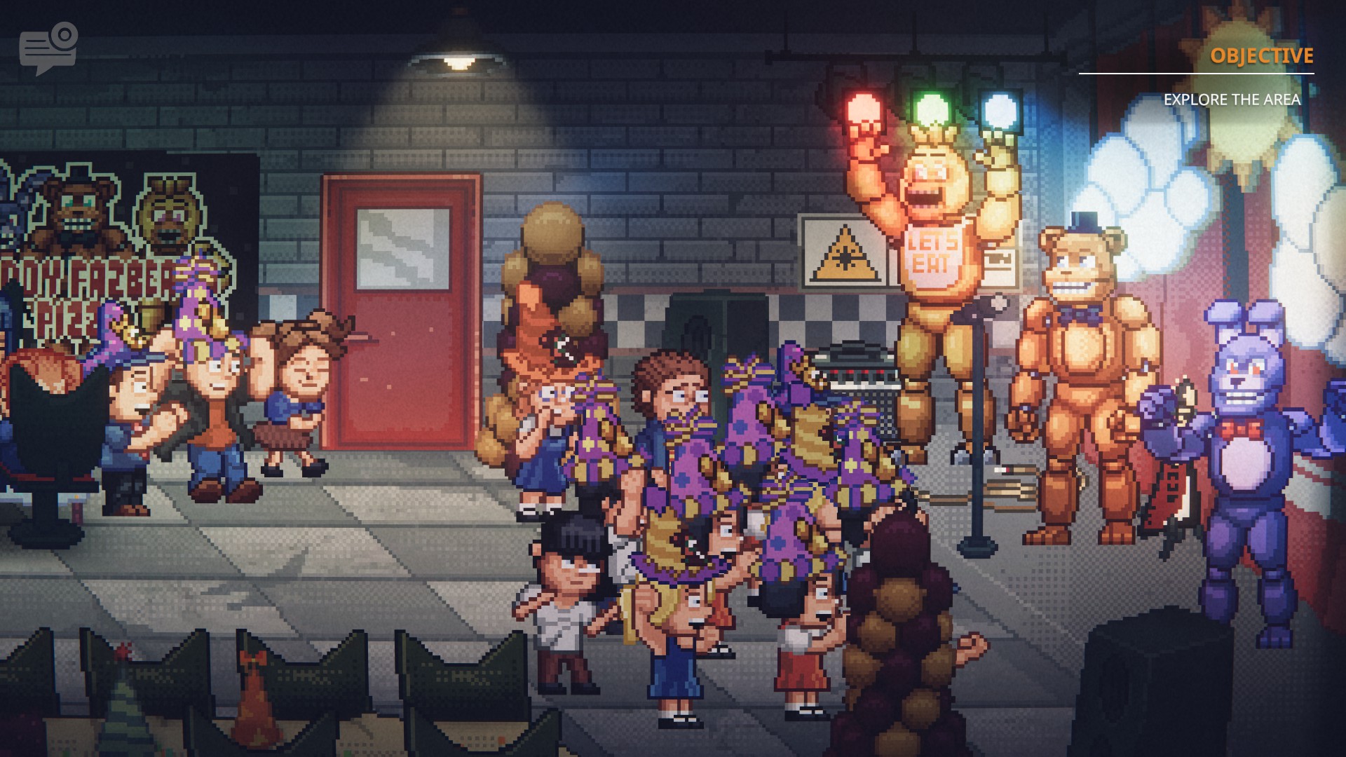 Into The Pit jedan je od tih spin-offova i moram reći da je jedno jako toplo iznenađenje! Na prvi je pogled uočljivo da je ovo potpuno drugačija prezentacija i stil gameplayja od ostalih FNAF igara. Koristeći se tzv. „pixel art“ grafičkim stilom koji je postao skoro sinonimom indie studija, igra izgleda nevjerojatno atraktivno. Fluidnost animacija, kretanje likova, detalji na svakom pojedinom liku i lokaciji, kao i različita osvjetljenja ovisno o dobu dana – sve je apsolutno predivno! Koncept je također inovativan, ali samo u sferi FNAF serijala, jer nagledali smo se ovog koncepta pogotovo u filmskome svijetu.