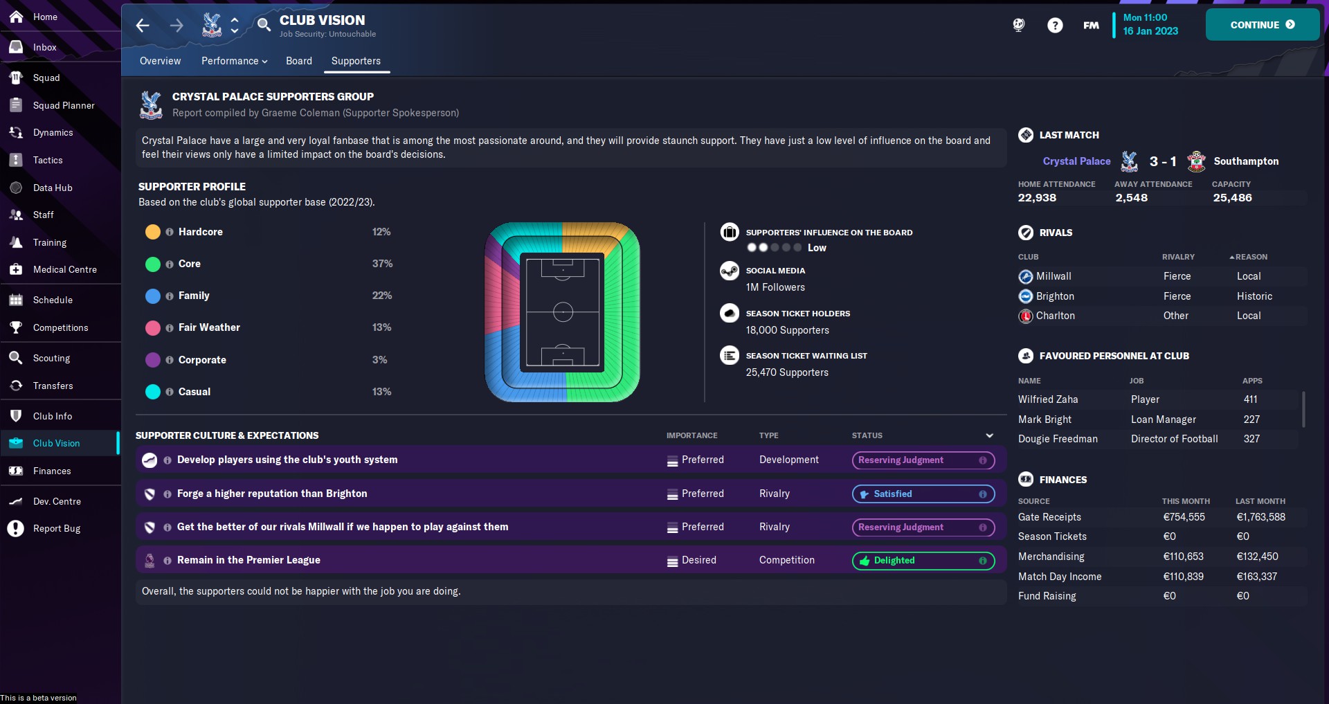 Jedna od značajki koju nitko nije očekivao a koju je Sports Interactive odlučio uvesti jeste uvođenje očekivanja obožavatelja kluba ili takozvani Expectations System. Od sada će obožavatelji kluba dobiti svoju riječ, odnosno moći će stvarati pritisak na vas i izjasniti se koja su njihova očekivanja za sezonu i za svaku utakmicu. U igri vas čeka šest vrsta obožavatelja i svaka skupina će imati svoje određene karakteristike. Hardcore navijači, možemo ih usporediti s Bad Blue Boysima, Core navijači (prosječni nogometni navijači), Family (takozvani obiteljski navijači koji već duže vrijeme prate klub), Fair Weather navijači (navijači koji žele samo uspjeh i dostignuće kluba), Corporate navijači (navijači koje zanimaju objekti stadiona i utrživost kluba) i ležerni navijači koji s vremena na vrijeme poprate klub. Vaš zadatak je da zapravo izgradite klub predstavljen u igri sa zahtjevima za povećanje broja pratitelja na društvenim mrežama. A u tom posebnom segmenti, također ćete doznati više informacija o vašem klubu, primjerice koji nogometaši su omiljeni u redovima navijača, tko su vaši rivali, koliko koštaju ulaznice, koja je kultura kluba itd.
