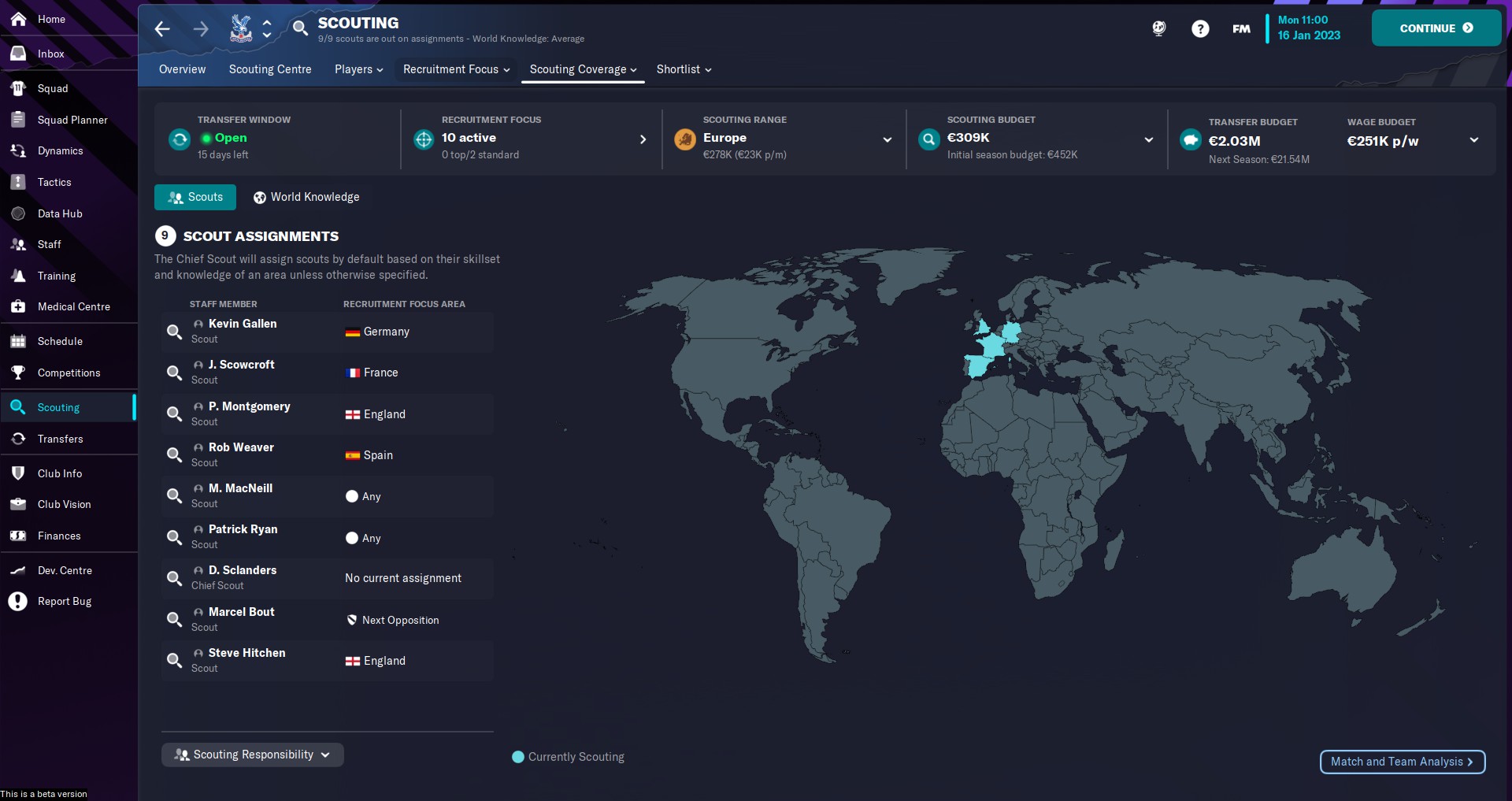 Ono što je također novo u ovoj igri jeste promjena grafike skautiranja. Ovo će vrlo vjerojatno biti kompleksno za novije igrače dok ne shvate kako sve to funkcionira. Bilo kako bilo, od sada ćete dobiti kartu cijeloga svijeta koja će vam pokazati koja mjesta trenutno skautirate, koja mjesta uopće niste istražili, koliko znanja imate o određenim državama itd. Također, Sports Interactive je pojednostavio je regije svijeta, tako da ćete moći konkretnije skautirati određene države. U prijašnjim verzijama niste mogli točno znati koja regija obuhvaća koje države, a da niste preko interneta otvorili posebnu kartu koja vam pokazuje te detalje. Sada će vam to biti pri ruci i moći ćete vrlo brzo odrediti zadatke svojih skauta. Uglavnom je cijeli taj sustav skautiranja ubrzan tako da većinu stvari nećete morati raditi ručno, osim ako taj zadatak ne zadate svojem osoblju, u tom slučaju nećete morati misliti na skautiranje, nego će vam predlošci igrača odmah dolaziti u inbox.