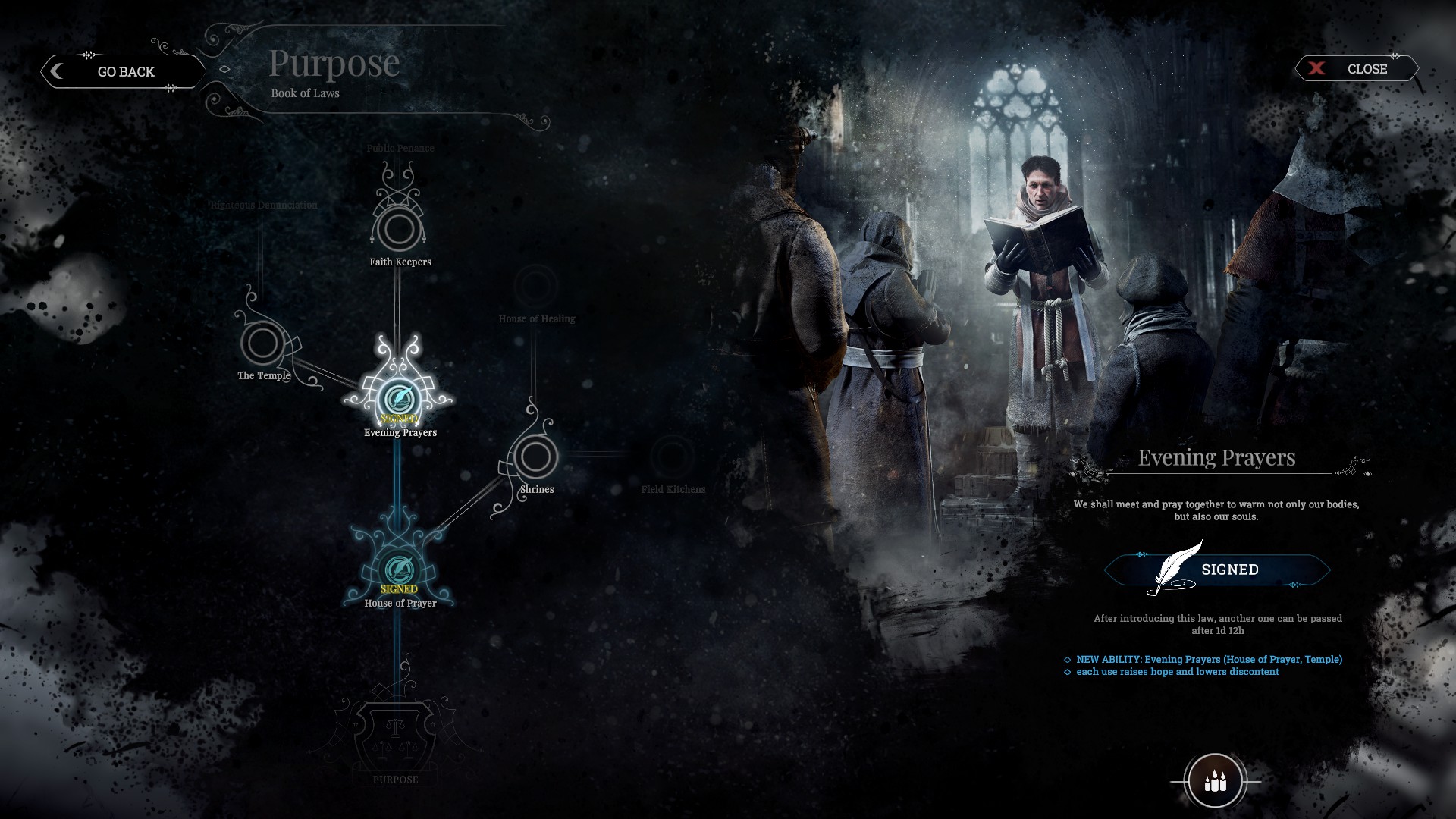 Svako toliko temperatura zraka će pasti na 40 ili više ispod ništice. Tada nastupa najveća kriza i na test dolaze odluke i smjer kojima vodimo naš grad. Smjer se ne ogleda samo u istraživanju tehnologije i eksploatacije resursa, već i u prilično dobroj mehanici „Knjige zakona“. Kako bismo održavali red i osiguravali zajednici potrepštine, često ćemo morati obećavati rješenja prilikom nastalih otežanih situacija. Ukoliko ih ne isposlujemo, nada će opadati, nezadovoljstvo rasti. „Knjiga zakona“ služi kako bi se donosile teške odluke, ponekad kompromisne, ali uvijek s cijenom. Kod donošenja tih zakona moramo biti na oprezu jer „knjiga“ ima cooldown , što znači da je potrebno pripaziti na tajming njihovih donošenja. Zakoni koje donosimo često oduzimaju komfort stanovništvu, ali dugoročno se isplate kao rješenje u težim prilikama. Npr. dodatna smjena rada u rudnicima, produžen radni dan, slanje djece u rudnike, ostavljanje amputirane osobe na nemilost zime…I slične morbidne odluke. Upozorio sam na nelagodne odluke i depresivne posljedice.