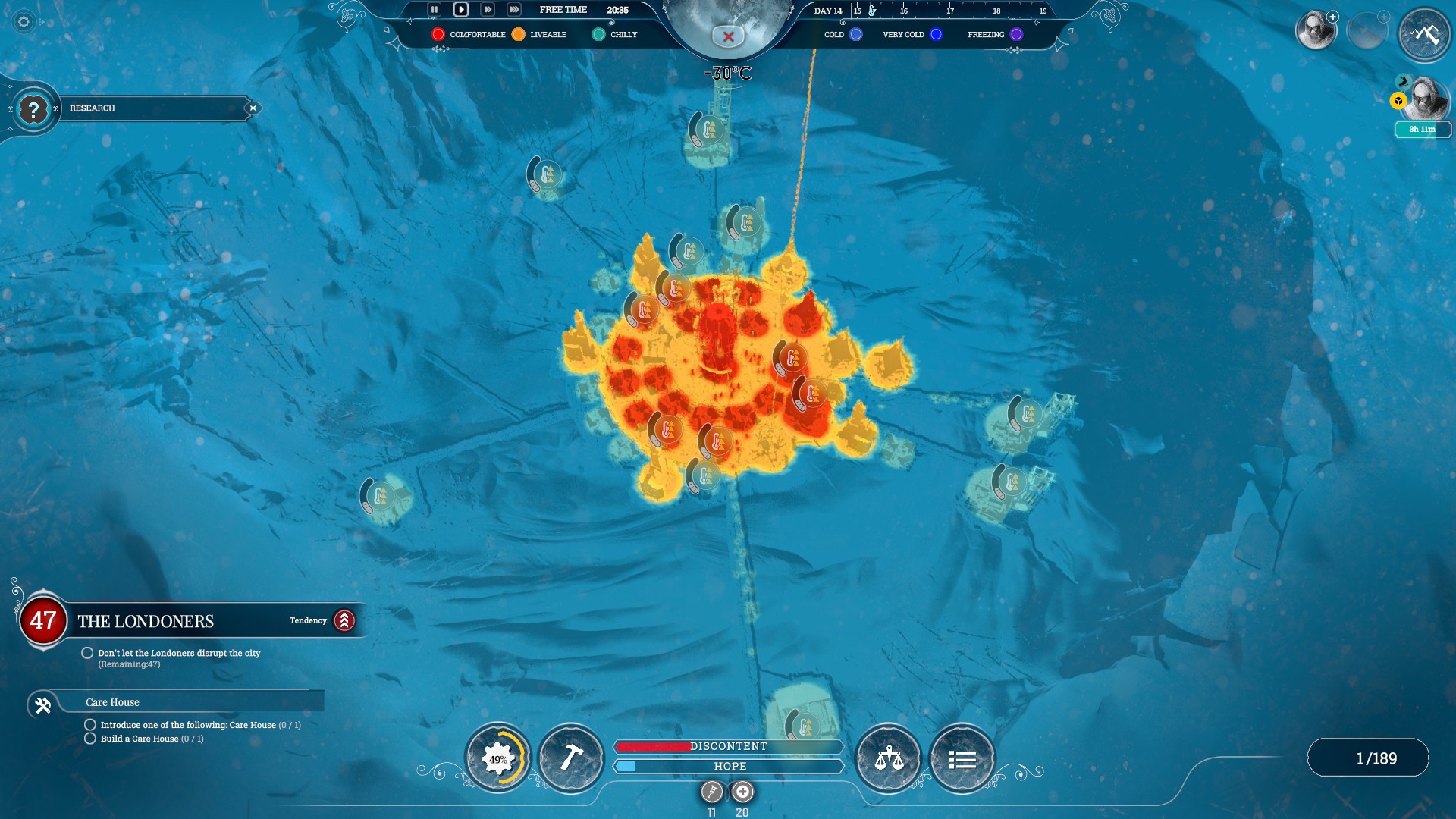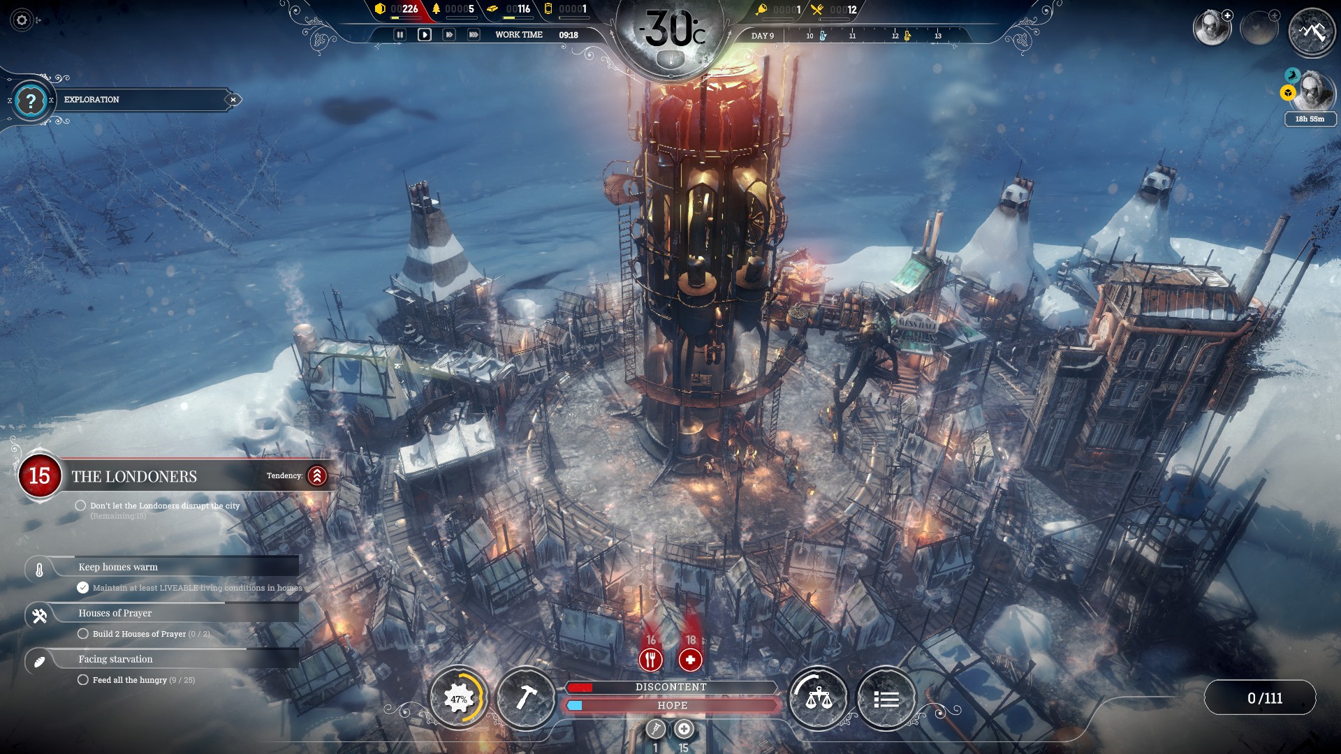U jednom trenutku igre, morat ćemo se odlučiti između dva generalna, pomalo distopijska, smjera s kojima ćemo uspostavljati zajednicu i graditi novo društvo. Jedan smjer vodi u strogo održavanje reda i discipline, pod čvrstom čizmom uprave grada ili smjerom vjere i duhovne snage. U oba slučaja borit ćemo se protiv agitanata koji će huškati stanovništvo na napuštanje grada i upuštanje u potagu za Novim Londonom, ako uopće postoji. U slučaju „željezne čizme“, obračunavanje s „Londonerima“ provodit će se agresivnije, dok će u smjeru „Vjere“ prevladavati pasivniji pristup koji se očituje izgradnjama svetišta i promicanjem nade u bolju sutrašnjicu. Svaki smjer donosi i novi set zakona, što Frostpunku daje još jedan dovoljan razlog za ponovno odigravanje.