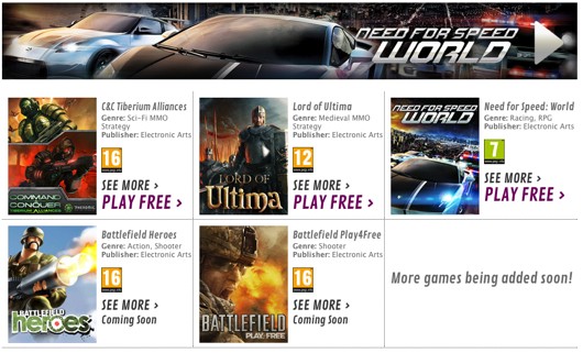 Free2Play trenutno u svojoj ponudi ima sljedeće EA-ove igre: strategijski MMO Command & Conquer: Tiberium Alliances, srednjovjekovni RPG Lord of Ultima i racing-RPG Need for Speed: World. Od ostalih igara najavljeno je kako će Battlefield Play4Free i Battlefield Heroes igre će uskoro biti dodane