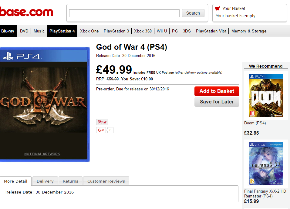 Sve više i više informacija dobivamo u zadnjih par mjeseci, koji se tiču četvrtog nastavka God of Wara. Danas je došao novi info/glasina/greška u obliku dostupne prednarudžbe igre na Base online dućanu. Prema ovome, izgleda da će Sony uskoro potvrditi igru i dati puno više informacije, a za mnoge je pravo vrijeme upravo ovoljetni E3 sajam za koji je Sony najavio ”nekoliko iznenađenja i velikih naslova”.