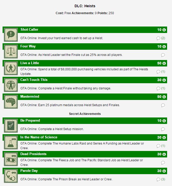 Sve lovce na achievemente i trofeje razveselit će informacija da novi Grand Theft Auto V Heist Update donosi čak devet novih izazova, koje će ti lovci morati ispuniti kako bi otključali jednak broj novih famoznih postignuća.