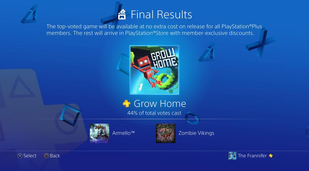 Naime, zahvaljujući Sonyjevoj Vote to Play opciji, igrači su mogli birati jednu od tri ponuđene igre, a ona koja dobije najviše glasova, trebala bi biti uvrštena u PS Plus Instant Game kolekciju naredni mjesec. Igračima su na izbor bile ponuđene igre Grow Home, Armello i Zombie Vikings, a prva je s 44% glasova proglašena “pobjednikom”, dok će druga dva ostvarenja stići na PlayStation Store s određenim popustima za sve PS Plus pretplatnike (u periodu do 15 rujna, PS Plus pretplatnici će spomenute igre moći kupiti po sniženoj cijeni za 30%).