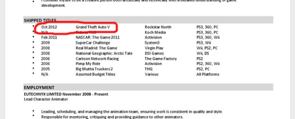 Rockstarov animator? Kakve on veze ima s time? Naime, Alex O’Dwyer, je animator likova za Rockstar Games, a u njegovom nedavno updateanom životopisu piše da je radio i na igri Grand Theft Auto V koja izlazi u listopadu 2012.godine. Stranica sa njegovim životopisom je ubrzo nakon obavijesti izbrisana tako da imamo samo screenshot Alexovog CV-a koji možete vidjeti na dnu ovog članka.