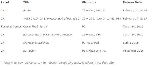 Take-Two je ovom prilikom objavio i svoje financijske rezultate za zadnji kvartal prošle godine. Tako posljednji kvartalni prihod ovog izdavača iznosi 531,1 milijuna dolara, što je znatno manje u odnosu na isti kvartal prošle godine, kada je ovaj izdavač ostvario profit od impresivnih 1.86 milijardi dolara. Naravno, za ove sjajne brojke najzaslužniji je svakako inicijalni izlazak igre GTA V, koja se u samo mjesec i pol uspjela prodati u više kopija nego što je GTA IV ukupno prodan. Naravno, ovom rezultatu ide u korist i prodaja drugih naslova, kao što su NBA 2K15, WWE 2K15, Borderlands The Pre-Sequel, a s obzirom da nas uskoro očekuje nekoliko novih hitova (raspored izlaska novih naslova možete vidjeti na slici ispod) te da će GTA V sigurno “otići” u još barem 10 milijuna primjeraka (PC inačica tek treba izaći), Take-Two uistinu nema razloga za brigu.