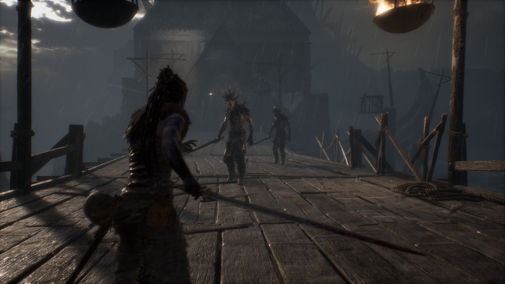 Treći element je gameplay, odnosno načini s kojima napredujemo u igri, a to su mehanika borbe i vizualne zagonetke. Kako se sama borba ne bi odvijala isključivo unutar Senue, pakao će ipak na nju poslati i bića iz tmine. Kao manifestacije Mraka koje će se pojavljivati u različitim humanoidnim oblicima i snagom (sve zahtjevniji kroz progres igre), Senua će morati koristiti svoj mač i jedan poseban predmet – zrcalo. Prilikom uspješnih izbjegavanja napada ili countera, zrcalo se napuni i vizualnim trikom nam daje znak kako Senua može ući u specijalni mod, te nemilosrdno poslati bića natrag u Mrak. Borba se zasniva na jednostavnim napadima i ponekad će se pretvoriti u zamorno mlataranje i nepotrebno zadržavanje. Srećom, igra nije niti blizu hack’n’slash stila kao što su prethodni naslovi Ninja Theoryja, tako nas tijekom igre očekuju i poduži segmenti bez borbe. Ispočetka će se činiti suhoparnom, ali pri kraju igre našao sam se investiran u borbu, ponajviše zbog „režiranja“ epskih trenutaka. Isto tako, uz pomoć zrcala i glasova, borbu možete voditi i u mraku, a doslovno vas i očekuju takve sekvence. Mogu razumijeti ukoliko se nekome ne svidi predvidljiva borba i telegramski potezi protivnika i pronaći borbu kao isuviše repetitivnu, nemaštovitu i ne sasvim izazovnu. Osobno, u kasnijim fazama igre, uživao sam u kombiniranju napada, korištenju zrcala i samom osjećaju Senuinog trijumfa u svakoj borbi unutar nemilosrdnog pakla kojim mora proći. Svaki osjećaj pobjede u Senuinoj glavi je dobro došao. Ipak, ne mogu opravdati nivoe u kojima se bez inspiracije nabaca horda protivnika kroz koje s određenom dozom zamora moramo pročešljati. Srećom, takvih trenutaka nema mnogo.