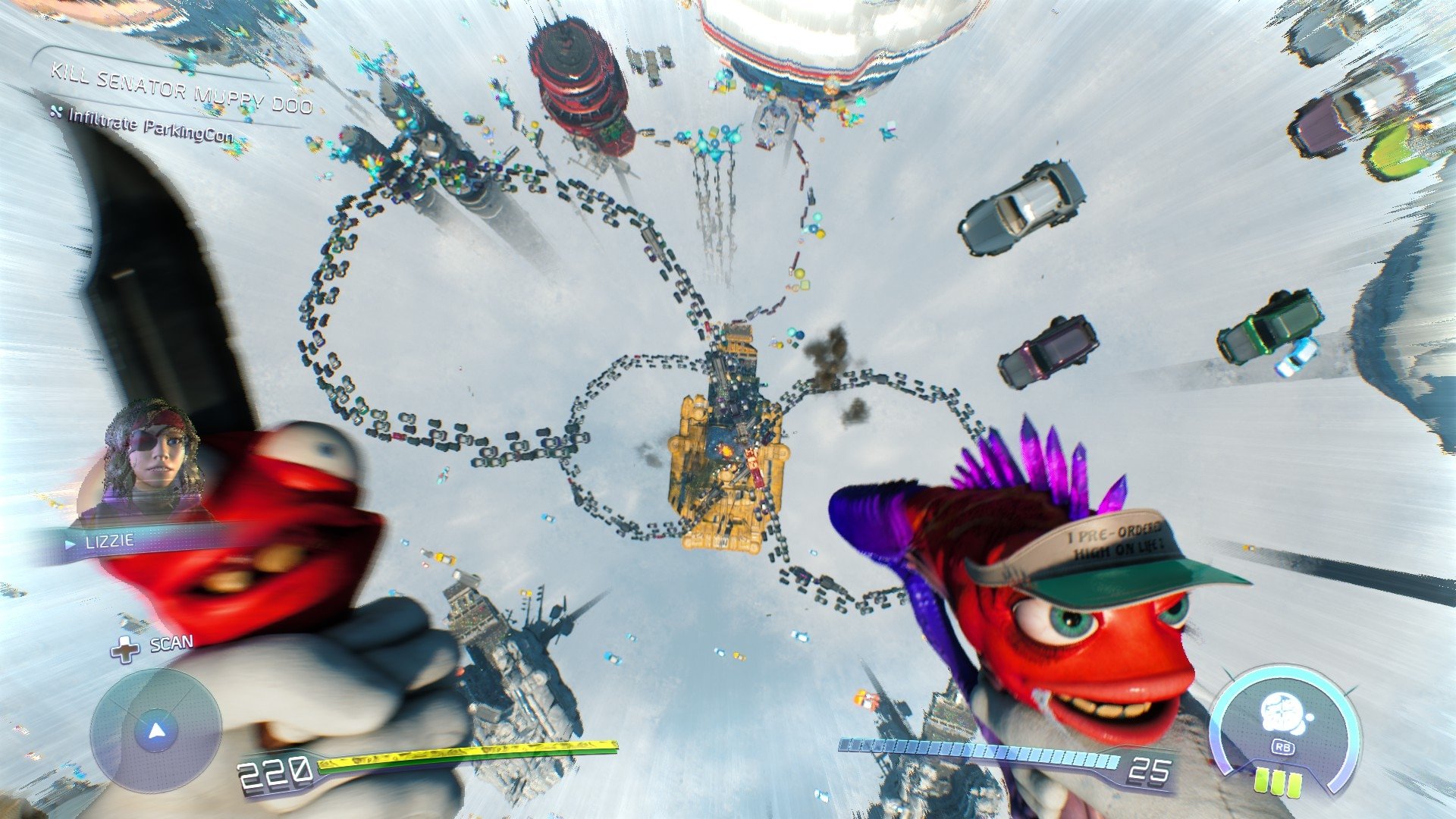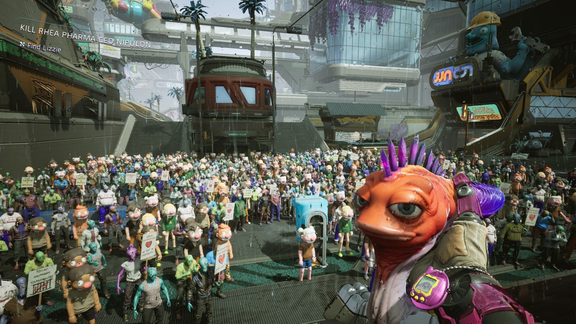 Što se tiče same priče, sada ste proslavljeni svemirski hitman koji živi u luksuzu, barem dok se galaksija, očekivano, ponovno ne raspadne. Novi antagonist više nije narko-kartel, već farmaceutska megakorporacija koja iskorištava čovječanstvo radi profita. Na papiru to zvuči kao oštriji društveni komentar. U praksi, djeluje kao remiks iste pjesme. Ljudi su prije bili konzumirani kao narkotik, a sada se prerađuju u lijekove. Satira povremeno dolazi do vidjela kroz ismijavanje korporativnog obožavanja, potkupljenih političara i kultne odanosti milijarderima, ali strukturne sličnosti s prvom igrom teško je ignorirati.