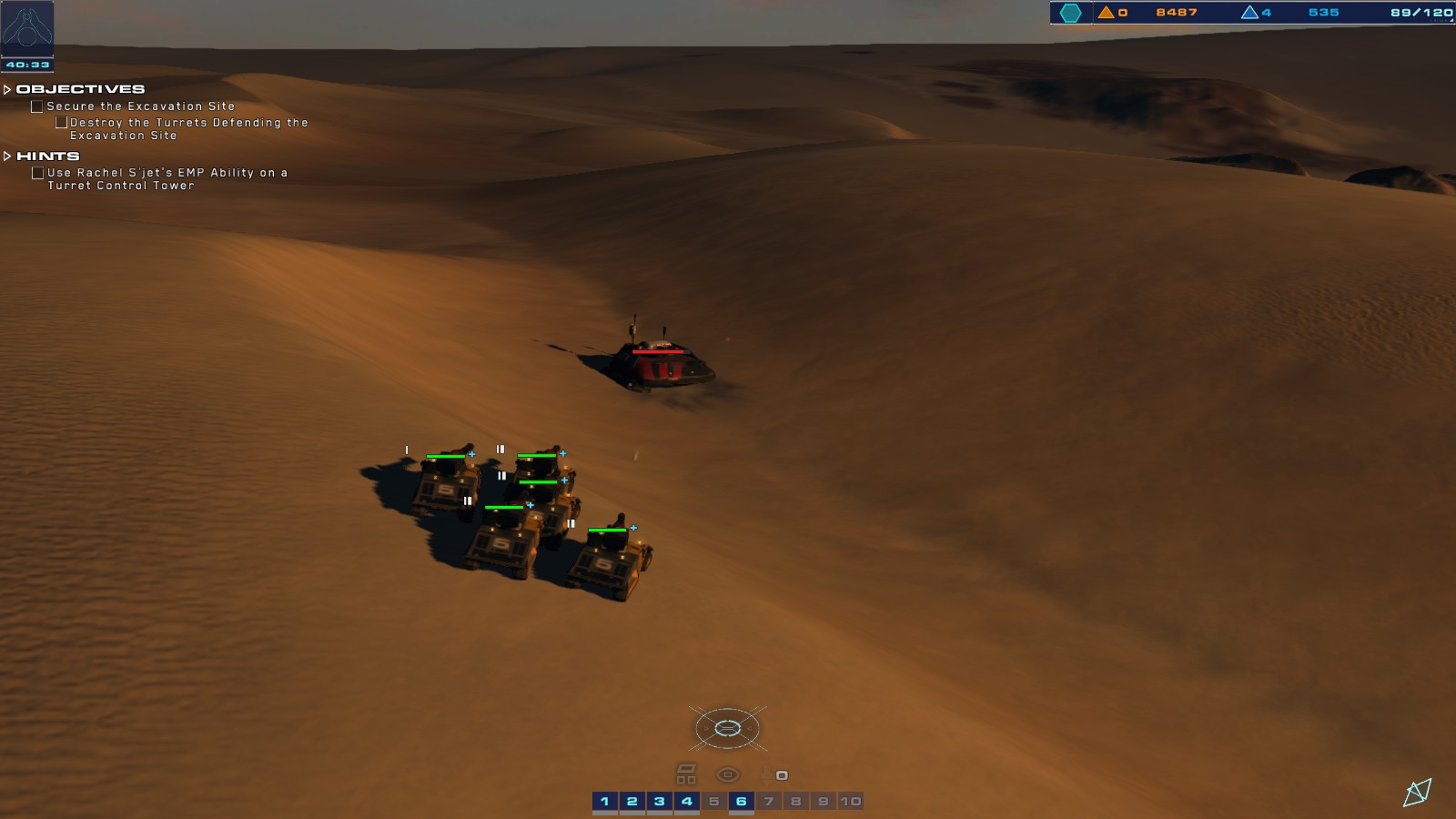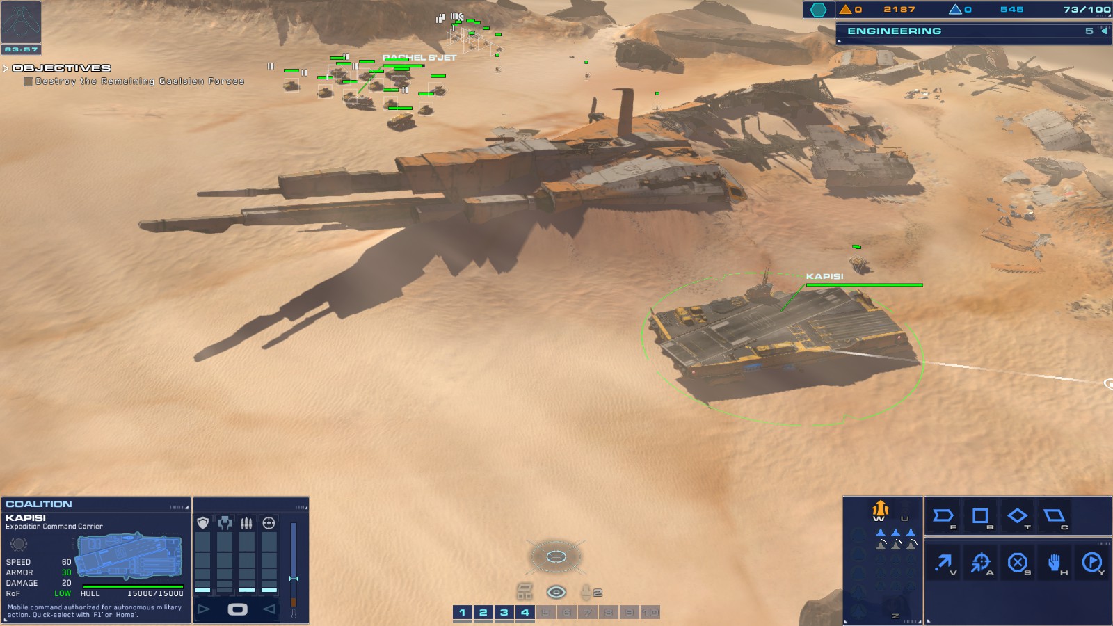 Tko je igrao Homeworld znati će kako je ovo RTS bez gradnje građevina i ostalih pogonskih infrastruktura. Ekspediciju predvodi nosač (svega) imena „Kapisi“, ekvivalent Mothershipu iz prethodnih naslova serijala. Pokretna baza koja služi kao proizvodni pogon i istraživački centar. Osim spomenutih letjelica (presretač, gunship i bombarder) „Kapisi“ proizvodi nekoliko klasa kopnenih vozila. Laka vozila poput sakupljača resursa ili baserunnera, teška vozila u koja spadaju railgun tenkovi, protuzračna vozila i teška oklopna vozila, kruzeri za support, artiljerijske i klasične bojne funkcije. Svaki tip vozila osim osnovne funkcije ( npr. lagana „bungie“ vozila su dobra protiv sporih railgun, artiljerijski kruzer za dalekometno raketiranje, baserunner postavlja turrete) ima i posebne sposobnosti, pasivna i/ili aktivna. Teška vozila mogu ispaliti dimnu bombu kako bi pokrili vidljivost i liniju vatre, „bungie“ imaju nešto slično nitro pogonu itd. Sam „Kapisi“ može poslužiti kao ubojito oružje. Svaku misiju preusmjeravate dostupne pointove u sisteme Kapisia (popravljanje, štit, damage i domet). No, s obzirom na pustinjsku klimu, postoji granica do koje možete iskorištavati sisteme kako se ne bi pregrijavali. Progresom kroz misije otključavaju se i razne tehnologije za istraživanje, koje su uglavnom otključavanje proizvodnje novih jedinica ili nadogradnja postojećih. Uglavnom klasične stvari, bolji domet, veći damage, oklopi, sposobnosti i slično. I na kraju tu je vozilo Rachel S’jet koje jedino uz Kapisi mora preživjeti svaku misiju, inače ekspedicija propada i game over. Racheline sposobnosti su zanimljive jer uključuju hakiranje protivničkih vozila i preobraćenja na stranu Koalicije. Ne, ne čuje se wololo wololo. Druga sposobnost izbacuje EMP granatu što onesposobljava protivnička vozila koja zatim mogu samo stajati i čekati da ih potaracaju oni railgunovi s vrha pješčane dine. Također Rachel je i shipbreaker. Na mapama učestale su olupine koje treba detonirati kako bi izbacile resurse, pojedine i artefakte koji nam nadograđuju određene funkcije, primjerice veću toleranciju Kapisia na pregrijavanje, pa možete iskoristiti još onih finih pointova u sisteme nosača. Usputno rečeno, dvije su vrste resursa, RU i CU. Ima ih u izobilju i većini misija imamo dosta vremena na raspolaganju kako bi ih pobrali. Primjerice, ako nam je posljednji zadatak unutar misije uništiti ostatke neprijateljskih snaga na mapi, možemo fino prolongirati obavljanje tog zadatka dok ne pokupimo resurse. Ima dosta prostora za manipulaciju po tom pitanju. Naročito ako protivničkom AI-u nedostaje upravo inteligencije.